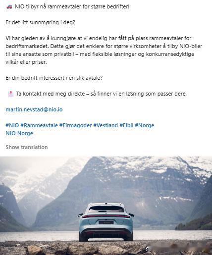 蔚来欧洲 蔚来在挪威推出企业市场框架协议。这将让大型企业可以更方便地为员工提供蔚来车型作为私人用车,并享受灵活的方案和极具竞争力的条款或价格。