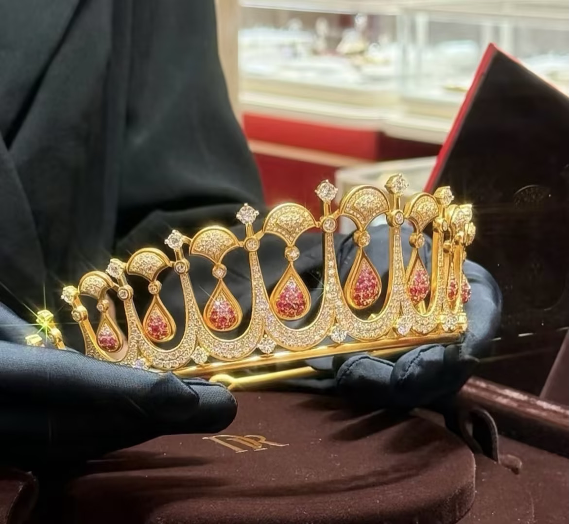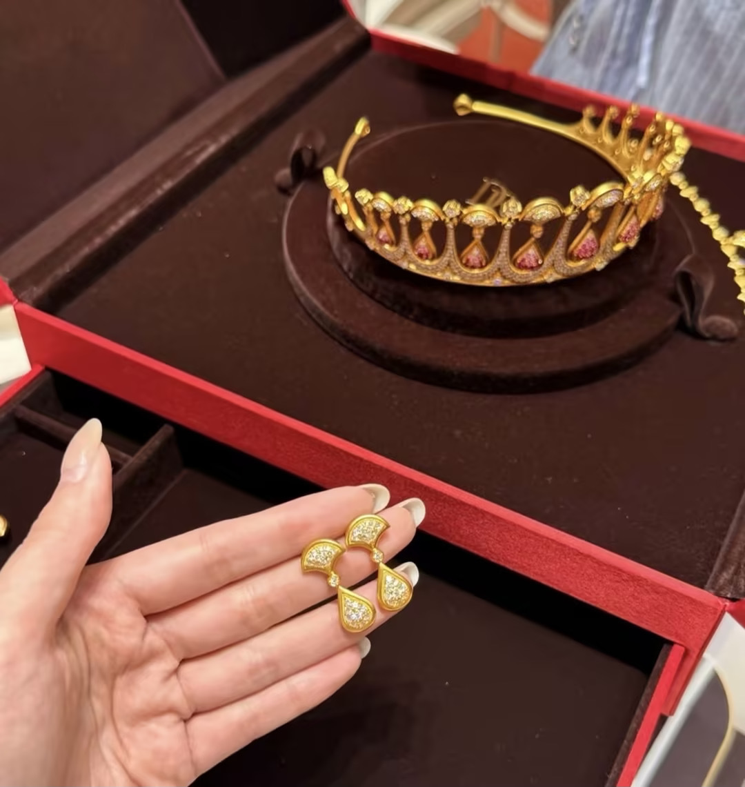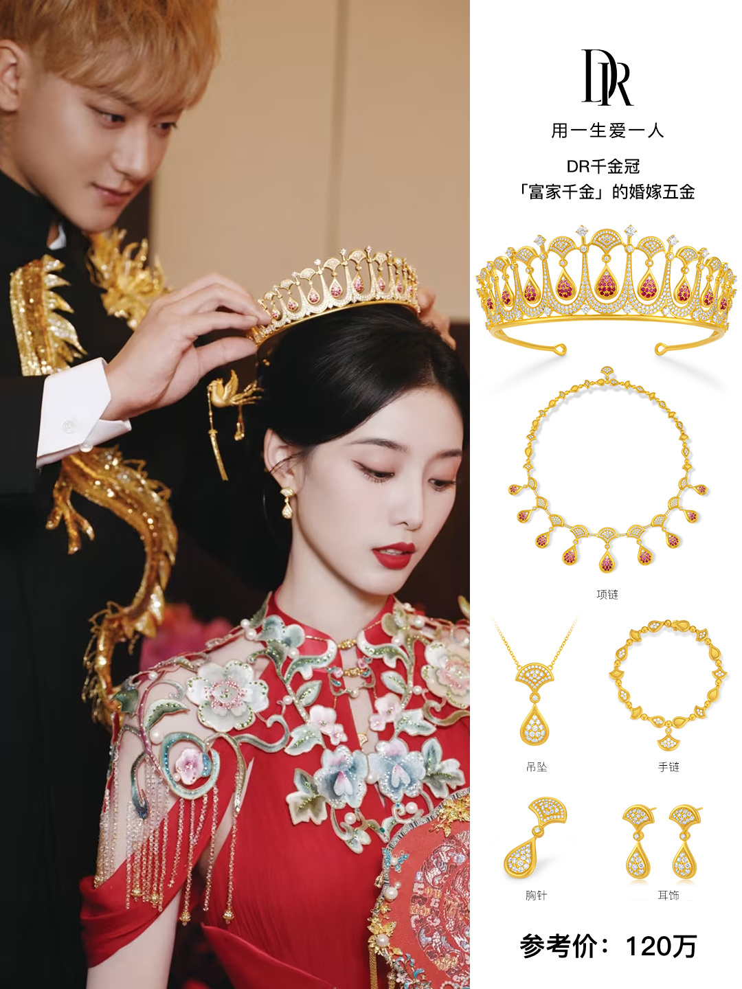 黄子韬给徐艺洋戴黄金皇冠 黄子韬中式敬茶环节给徐艺洋戴的 DR 千金冠设计不仅美,还巧妙。DR独创 “冠饰可转换结构”,可将皇冠自由转化为手链、项链、胸针、耳饰、吊坠等多款珠宝,既丰富了佩戴场景,又解决了传统婚嫁五金使用率低的痛点,尽显创新的中国智慧。不过,没想到DR除了钻戒还有婚嫁五金,有被惊艳到!再配上DR一生只送一人的寓意,这婚礼皇冠是选的相当智慧。被徐艺洋婚礼中式皇冠美哭了