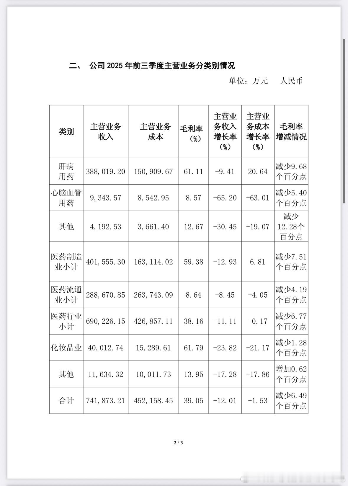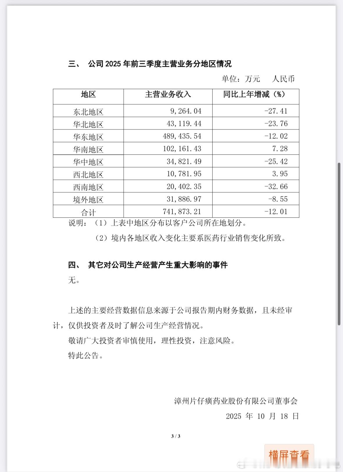 片仔癀发布公告称,2025年第三季度实现营业收入20.64亿元,同比下降26.28%;归属于上市公司股东的净利润为6.87亿元,同比下降28.82%;归属于上市公司股东的扣除非经常性损益的净利润为4.38亿元,同比下降54.6%。2025年前三季度实现营业收入74.42亿元,同比下降11.93%;归属于上市公司股东的净利润为21.29亿元,同比下降20.74%;归属于上市公司股东的扣除非经常性损益的净利润为18.91亿元,同比下降30.38%。