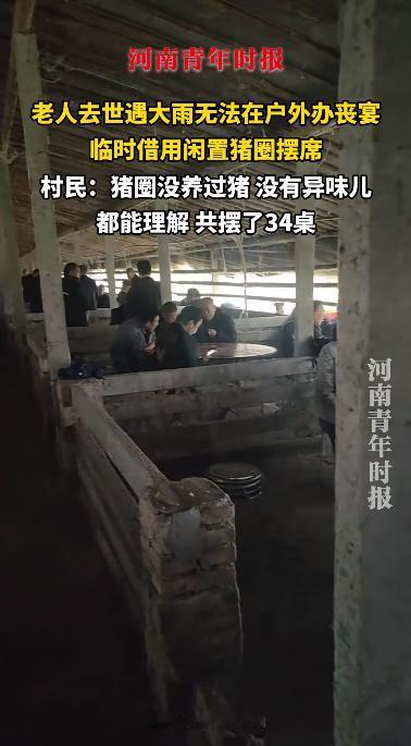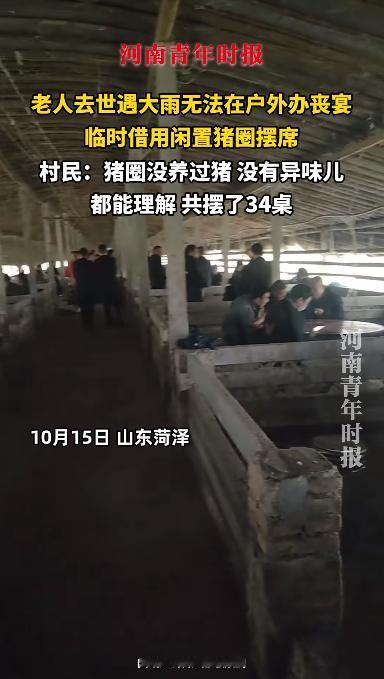 “活久见!”10月15日,山东菏泽,一老人去世后,家里人本打算为老人办白事,结果天上突然下起了大雨,来吊唁的宾客都没法正常吃席,无奈之下主人家只好借用了一个猪圈,在猪圈里摆起了宴席,网友:没想到直接大厅变“包间”了! “纯真的感情 理解的善良啊....” 李先生(化名)的家人去世,按传统习俗,家属准备在院子里办白事。 白事是一项庄重的仪式,亲朋好友会齐聚一堂,共同为故人送行。李先生的家里准备了充足的席面,打算摆放34桌,场面庞大,准备在院子里搭建一个大型的棚子,为前来参加的亲戚朋友提供一个可以遮风挡雨的场所。 可连续几天的暴雨却让这一切的安排都变得难以实现。 10月的天气变幻无常,刚开始时,大家还以为只是偶尔的小雨,没人想到它会持续几天。 院子里铺满了泥泞,湿滑的土地让本就忙碌的家属和亲友们更添困扰。 原本宽敞的院子如今变得水洼遍地,泥巴厚重,根本无法正常行走。 工人们本计划搭建的棚子被雨水浸泡,一些材料也变得湿漉漉的,工作进展缓慢,甚至有些木板和布料被暴雨冲坏,无法使用。 本来井井有条的白事准备工作开始陷入混乱。 为了避免无法正常席散,家属试图寻找临时的解决办法。 正当大家一筹莫展时,邻居主动提出了一个解决办法。 原来他们家有一间闲置的棚屋,本来是准备用来养猪的,但由于种种原因一直没开始使用,空着闲置了很久。 棚屋虽然简陋,但至少干净整洁,面积也足够大,可以遮风挡雨,算是一个能暂时解决问题的地方。 李先生一家觉得,虽然条件并不理想,但总比继续在泥泞的院子里搞下去要好。经过一番商量,亲戚们也一致同意了这个提议,大家都知道,这种事情本就无法预见,能有个场地已经算是解决了大问题,没人会太挑剔环境的好坏。 当天,村里的几个村民赶来帮忙,纷纷开始清扫棚屋,打扫里面和周围的地方,确保干净整洁。 虽然这里并没有像传统的宴席那样精致豪华,但所有的流程和礼节都没有少,送别亲人的气氛依然庄重。 随着时间的推移,前来吊唁的亲戚朋友们陆续到达。虽然看到宴席设置在棚屋里时,有些人略微愣了一下,但很快他们就接受了这个现实。 毕竟,大家都是乡里乡亲的,谁没有经历过一些突发的情况? 能在这种天气下办起白事,已经不容易了,谁还会过分挑剔环境的好坏? 事实上,农村的白事一直都是一个难题。过去的传统要求办白事时要讲排场,桌子上摆满了各种美味的酒菜,一场白事往往能摆上百桌,花费也很高,一家人可能要为此倾尽全力。而这些年,随着节俭的风气逐渐兴起,许多地方都开始倡导简办,改成了“一碗菜”,每位来宾一份,这样既能保持一定的仪式感,又不至于过度铺张浪费。 这场雨中的宴席,尽管环境简陋,但庄重的氛围依旧维持着。 34桌满座,亲戚朋友们都坐得端正,大家安静地等着仪式的开始。 按照传统,主家的孝子们依照习俗,轮流上前给来宾磕头,并请大家就座吃饭。整个现场沉浸在一种肃穆的气氛中,没有人大声喧哗,大家都明白这场白事意味着什么。虽然桌子上没有华丽的菜肴,场地也不完美,但每一个细节都尽量做到位。 大家深知,重要的并不是宴席的豪华,而是送别亲人时那份庄重与尊重。