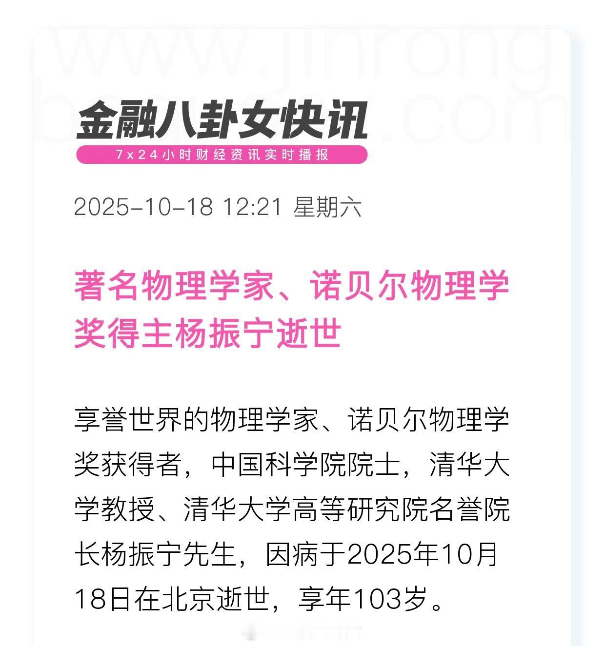 著名物理学家、诺贝尔物理学奖得主杨振宁逝世 杨振宁逝世