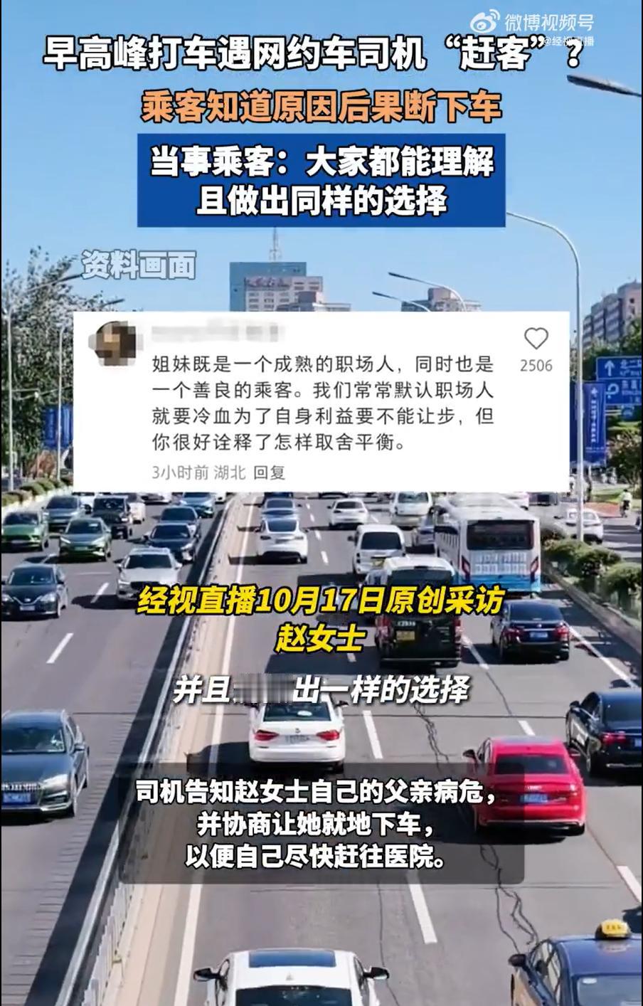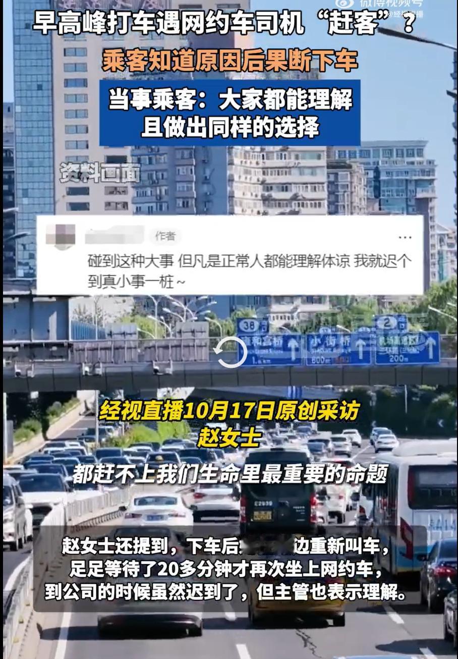 破防!北京早高峰暖心一幕:司机父亲病危,乘客秒下车还拍证自证 17 号北京早高峰,赵女士的网约车刚开 1 公里就突然停下。司机红着眼哽咽:“我爸病危,能麻烦您下车吗?” 赵女士二话没说抄起手机,对着行程记录拍了张照 —— 不是要维权,是怕上班迟到没法跟老板解释。她边下车边催:“师傅快走吧,路上小心!” 等了 20 多分钟才重新打到车,迟到后老板一听缘由立马表示理解。网友全夸她:“善良又清醒,这才是成年人的体面!” 你说,这种陌生人的互相体谅,是不是最暖的城市风景?