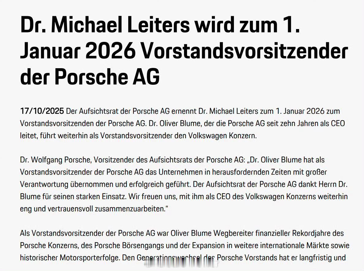 由迈克尔·莱特斯(Michael Leiters)接替掌舵保时捷近十年的奥博穆(Oliver Blume)