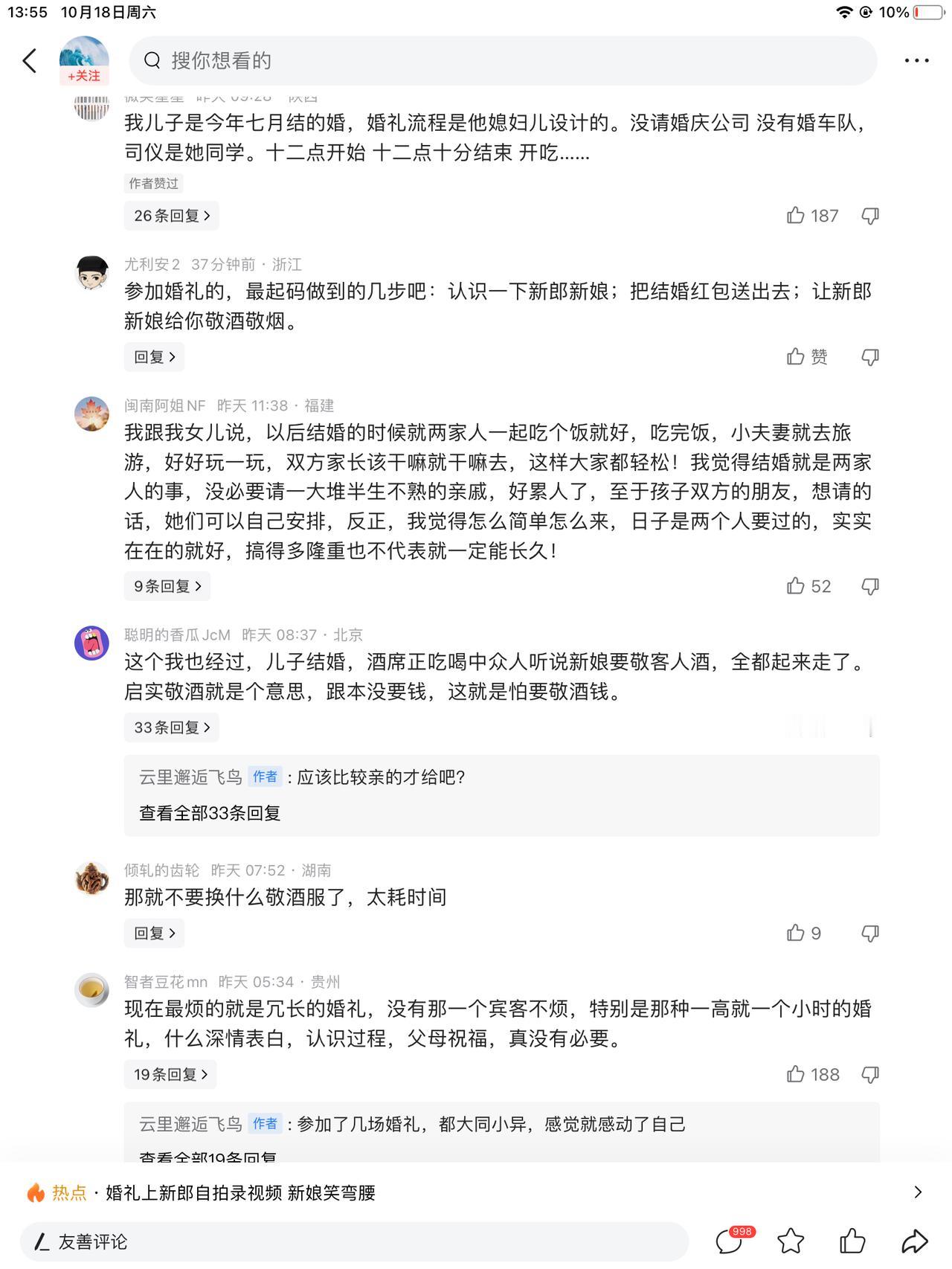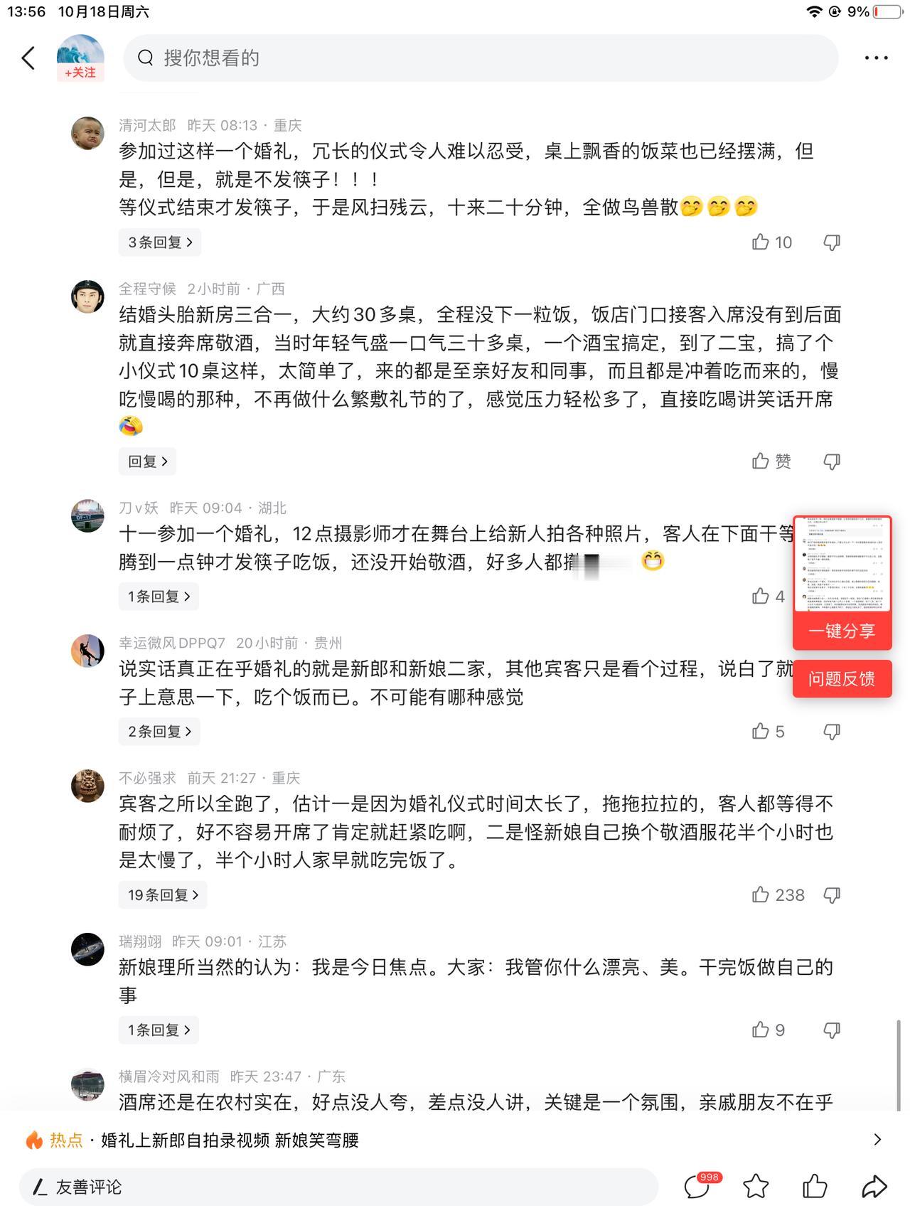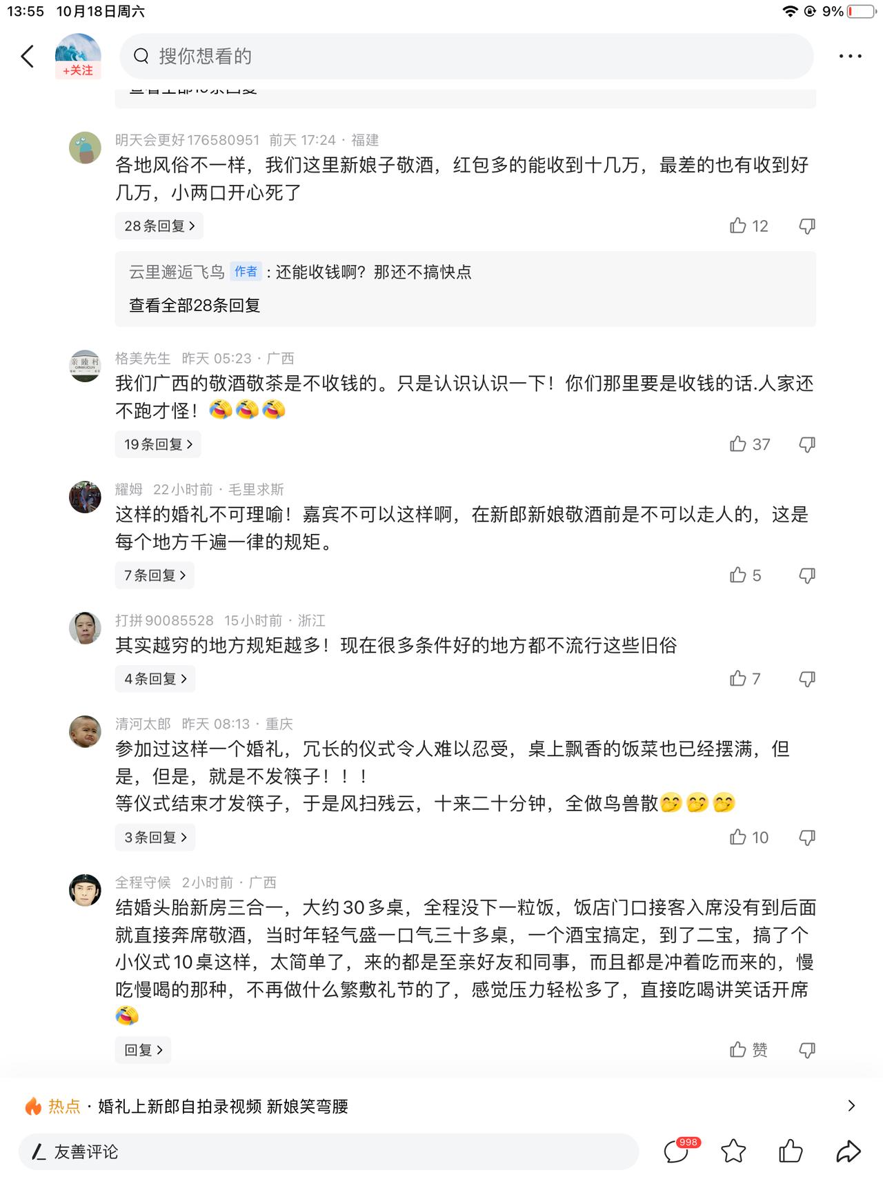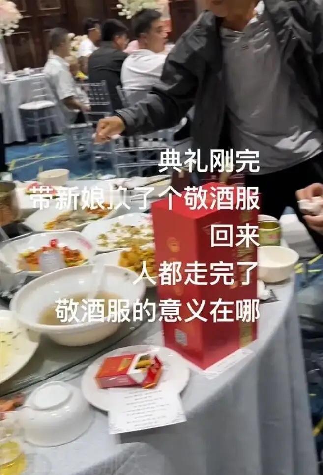贵州新娘换了套敬酒服,回来一看人走光了,菜吃完了,酒足饭饱以后,宾客自觉的撤了! 各地风俗不一样,不能笑话,笑不着人家。 我们这边,只有新郎跟着自己的爹挨桌敬酒。新娘落座以后由伴娘陪着,只管吃喝就行了。每一次上新菜,第一筷子夹出来,找个碗装着,回去给自己的爹妈尝尝。当天新娘被接到婆家以后,第二天才回娘家。叫回门。 我是个马大哈,我都忘了,我夹完菜以后,我妈啥时候吃上我捎给她的菜,是当天我妹她们带回去的,还是第二天我带回去的。忘了。也没人挑理。 刷到过好多年轻人新事新办,简化流程,感谢一下父母来宾,一句开席大伙儿一块搂起来了,大快朵颐,真是好不快乐![星星眼][星星眼][星星眼] 网友那句话说的好,只有新娘在乎这个流程,希望每一个环节都力争完美,给自己留下好的印象。其实,真没那么重要,我结婚的录像带都找不到了,平常谁还拿来看看?照照镜子,老帮菜了,看那有啥用。日子是过现在,不是过过去,更不是过未来的幻想。 每一天,照顾好自己,操心下孩子,搭理下父母。朋友之间,爱联系就发个信息,不爱联系就拉倒。谁也不是谁永恒的爱。 自从有个人找我借钱,我借了以后。他说啥,我都觉得他不努力。以后谁也不借了,没意思。