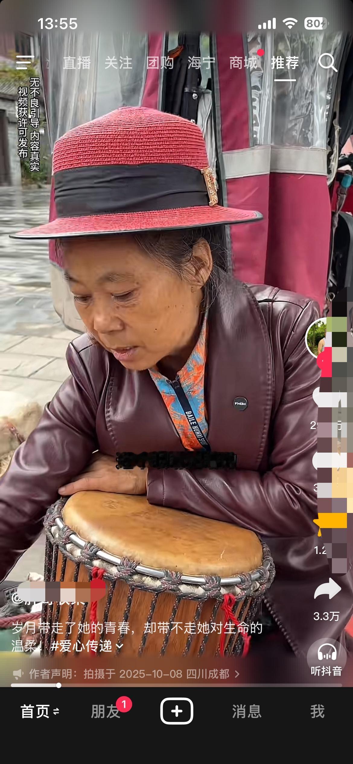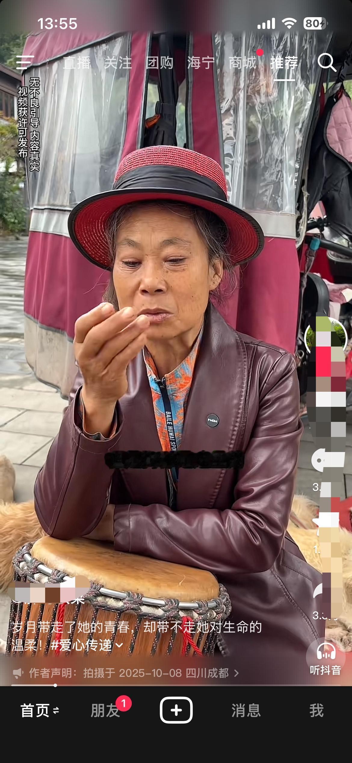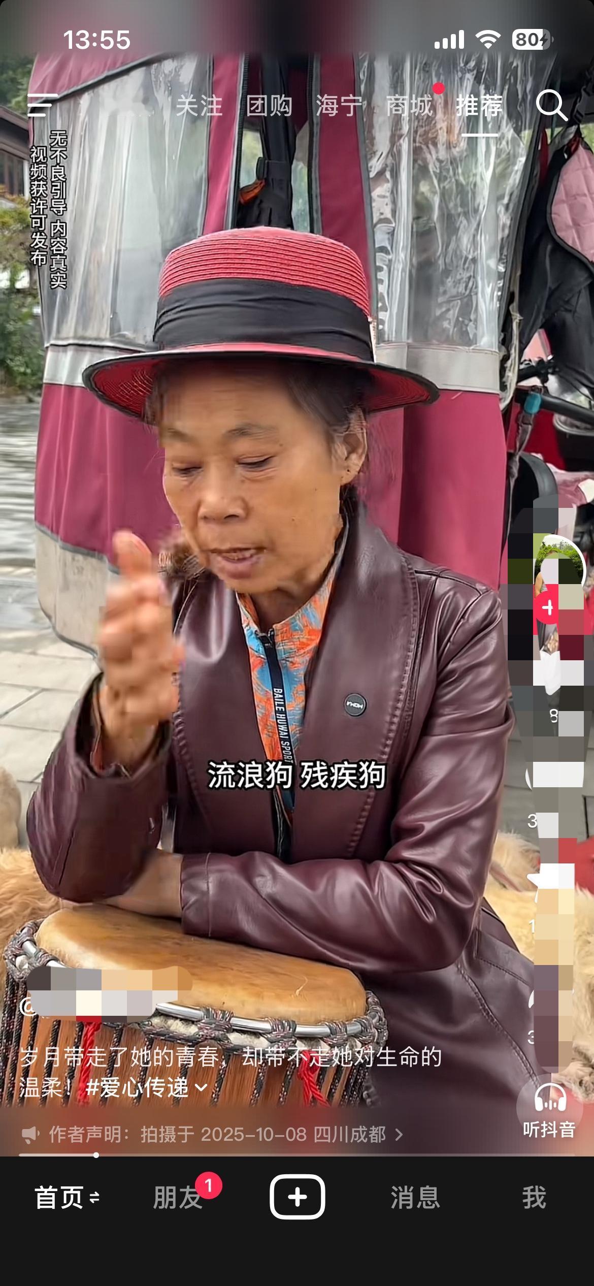 成都街头,一位戴着红黑相间帽子、穿酒红色皮衣的大妈,身边围着好几只狗狗,她敲着鼓