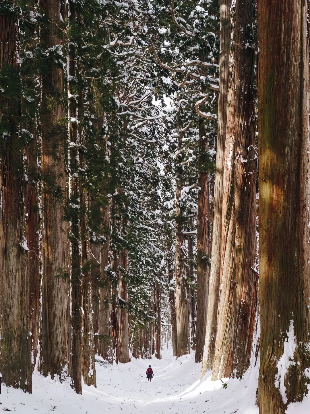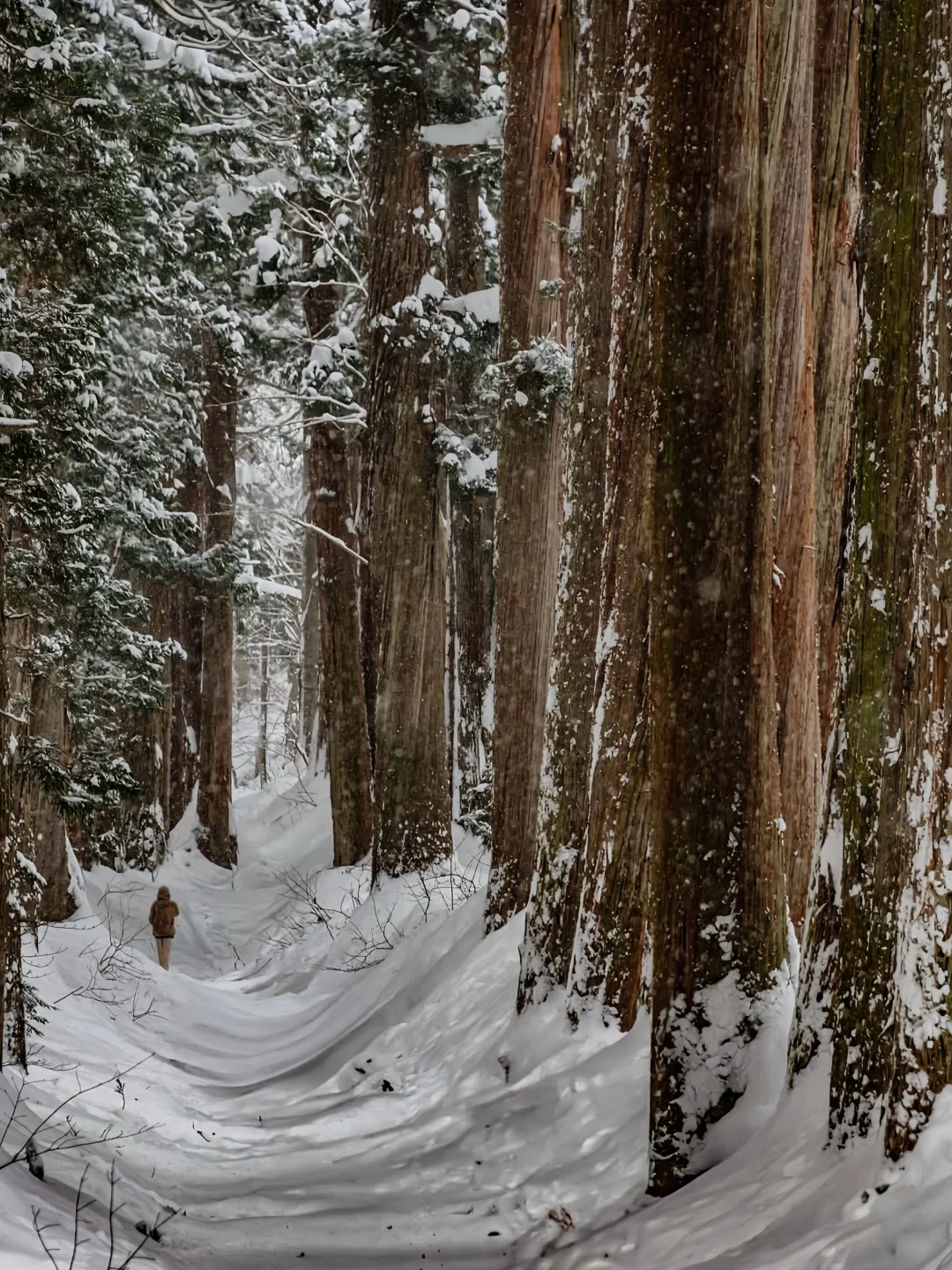 [蓝色心形R]雪中杉木参道:冬日积雪覆盖的杉树林,静谧如梦。哪怕冬季道路被雪封住,林间依然流淌着前往奥社的神圣气息。