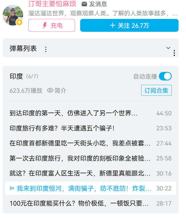 内容非常有趣,笑死我了,up主叫汀哥主要怕麻烦,他应该是待一个月,去了好几个城市,景区、市中心、富人区都去了,就用个GoPro一路拍过去。