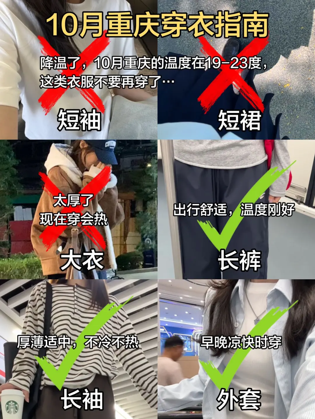 去重庆的时候本来好好的,长袖长裤不冷不热,突然降温😱差点被冷死🥶 🌡️平均气温:19-23度 👔穿衣tips:两件叠穿,外套衬衣长袖长裤卫衣自由搭配,短裙和短裤不能再穿了