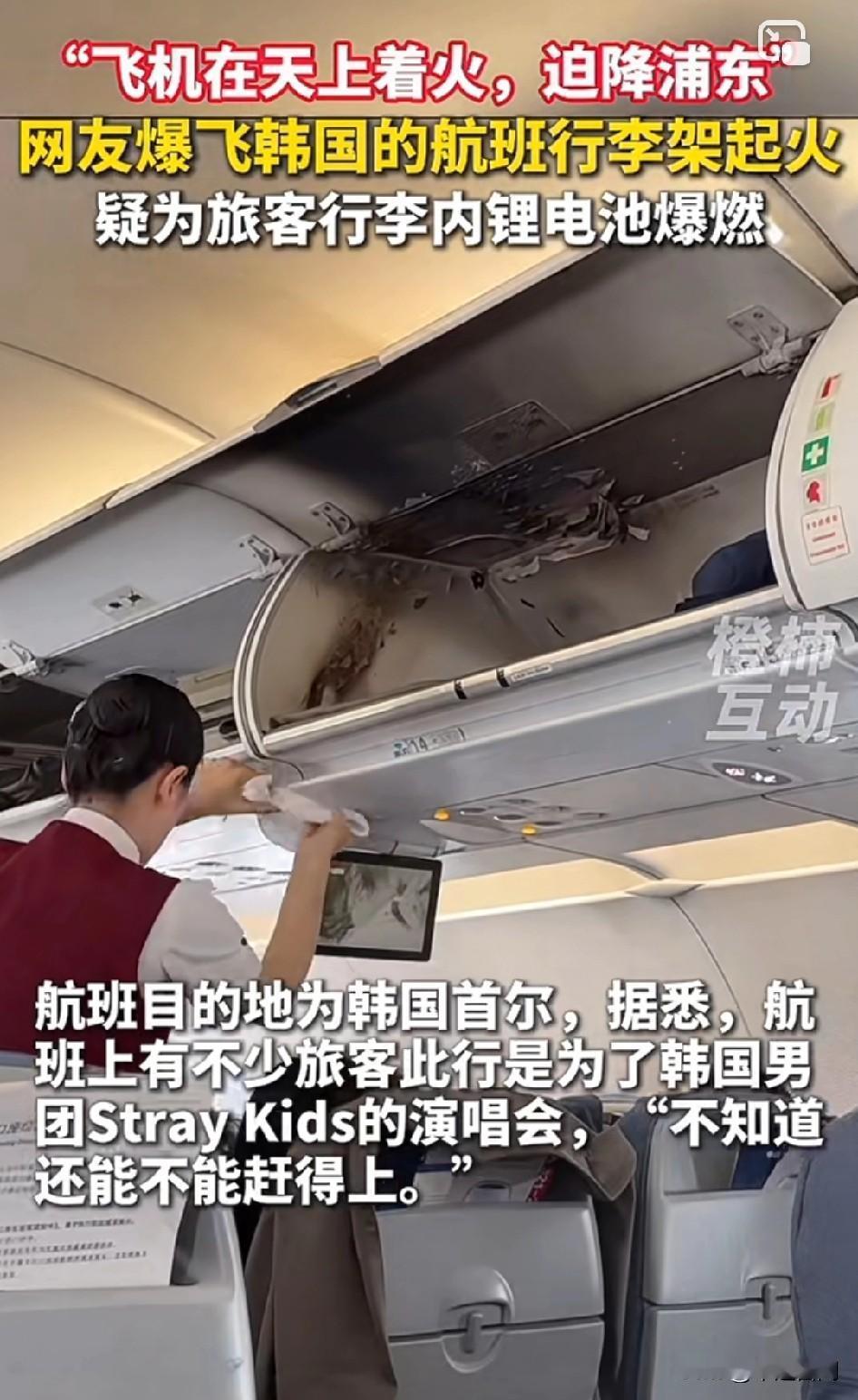 惊险一幕! 刚刚有飞机起火了, 乘客听到“砰的一声”爆炸声,从行李箱内冒出熊熊小火,在美女空姐紧急正确快速的处理下,转危为安! 但是听说大部分乘客都是去韩国为了韩国男团“Strike kids演唱会,估计赶不上了,先保住小命要紧。 杭州飞韩国一航班,有旅客行李内锂电池自燃。 责任是乘客还是安检人员呢?