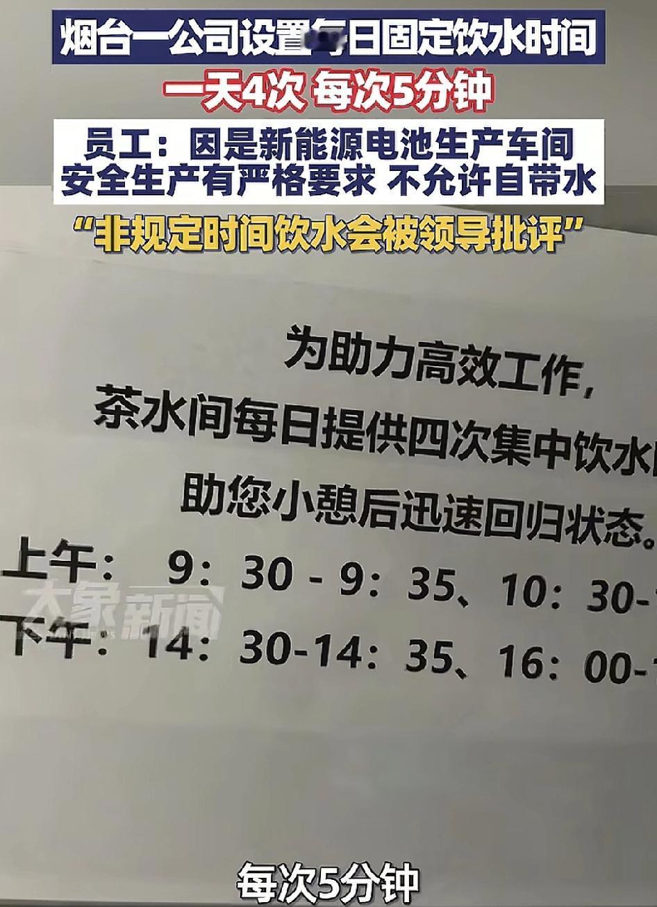 10月17日,烟台一公司有员工爆料公司设定每天员工饮水的时间一天只有4次,每次仅有5分钟,如果员工在不规定的时间饮水会遭到领导的批评。网友们批评这样的公司实在非常不人性化,跟那些流水线的员工规定时间上厕所如出一辙,当然也有网友认为公司这样做是防止员工摸鱼,特别是有的岗位一天上班8个小时,可能实际上摸鱼的时间比工作的时间还要长。但是对于那些投入工作的员工来说,基本上不会想着什么时候喝水,有时候是真渴了才会想着去接水,但这个时间如果不在规定的时间内去接了水,那又如何处置。