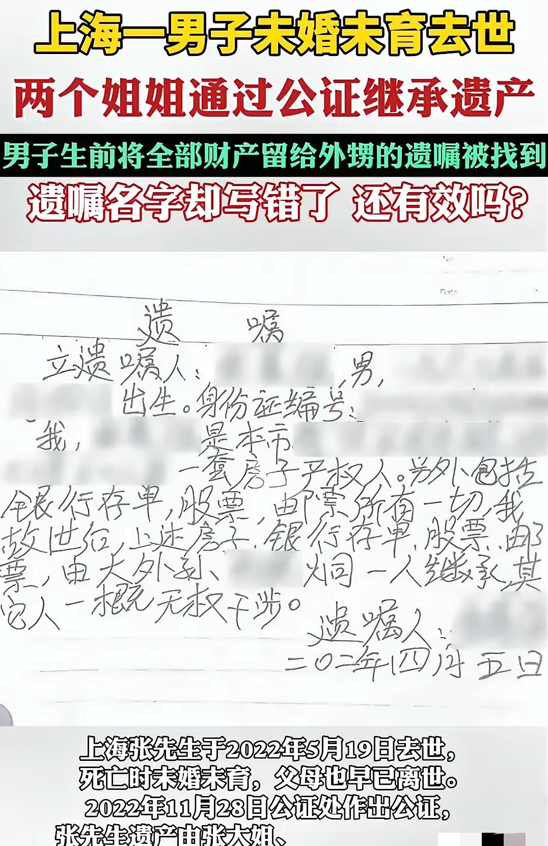 上海有个张先生,一辈子没结婚,也没孩子,父母走得早,平时跟两个姐姐和二姐家儿子李炯比较亲。2022年张先生去世后,留下了房子、股票还有银行存单。两个姐姐张大姐和张二姐就去办了法定继承公证,想着把遗产平分了。 谁知道,2023年3月,李炯帮舅舅整理遗物的时候,在一个旧盒子里翻出了份手写遗嘱。遗嘱里写着张先生名下的房子、银行存单、股票、邮票等所有财产,去世后全归“大外孙李烔”一个人继承。李炯挺感动的,赶紧在3月13日把遗嘱拍了照,通过微信发给母亲张二姐,还说“我接受舅舅的遗赠”。张二姐又把遗嘱照片和儿子的意思转发给了张大姐。 张大姐一看就不乐意了,本来能分一半遗产,现在全归外甥了,心里肯定不平衡啊。她就说这遗嘱就算是真的也无效,之前的公证才作数。就这样,亲戚之间闹僵了,最后闹到了法庭上。 法庭上,张大姐说遗嘱里把“外甥”写成“外孙”,“李炯”写成“李烔”,肯定不行。但法院一查,张先生文化程度不高,上海话里“甥”和“孙”发音差不多,而且张先生也没有外孙,亲戚里也没有和“李炯”名字相近的人。结合遗嘱内容和房子的登记时间等,能看出来就是想把遗产留给李炯。 另外,李炯在发现遗嘱后60天内,就通过微信向母亲和大姨表示接受遗赠,有聊天记录为证。所以啊,法院就认定这份遗嘱虽然有点小毛病,但不影响它的法律效力,遗产得由李炯继承。张大姐不服上诉,二审还是维持原判。 这案子一出来,网友们看法不一。有人觉得大姨就是贪心,有自己的家庭还盯着弟弟遗产,法律就该保护舅舅把遗产给外甥的想法。也有人同情大姨,觉得姐姐们本来以为能分遗产,突然冒出个遗嘱,换谁都不好接受。 在我看来呢,法院的判决没毛病,法律就是得讲证据、讲事实,要保护立遗嘱人的真实意思。不过从人情角度看,这事儿确实让亲戚之间的关系变得很糟糕。要是张先生生前能跟姐姐们说一声有遗嘱这事儿,可能就不会闹成这样了。 各位读者你们怎么看?欢迎在评论区讨论。