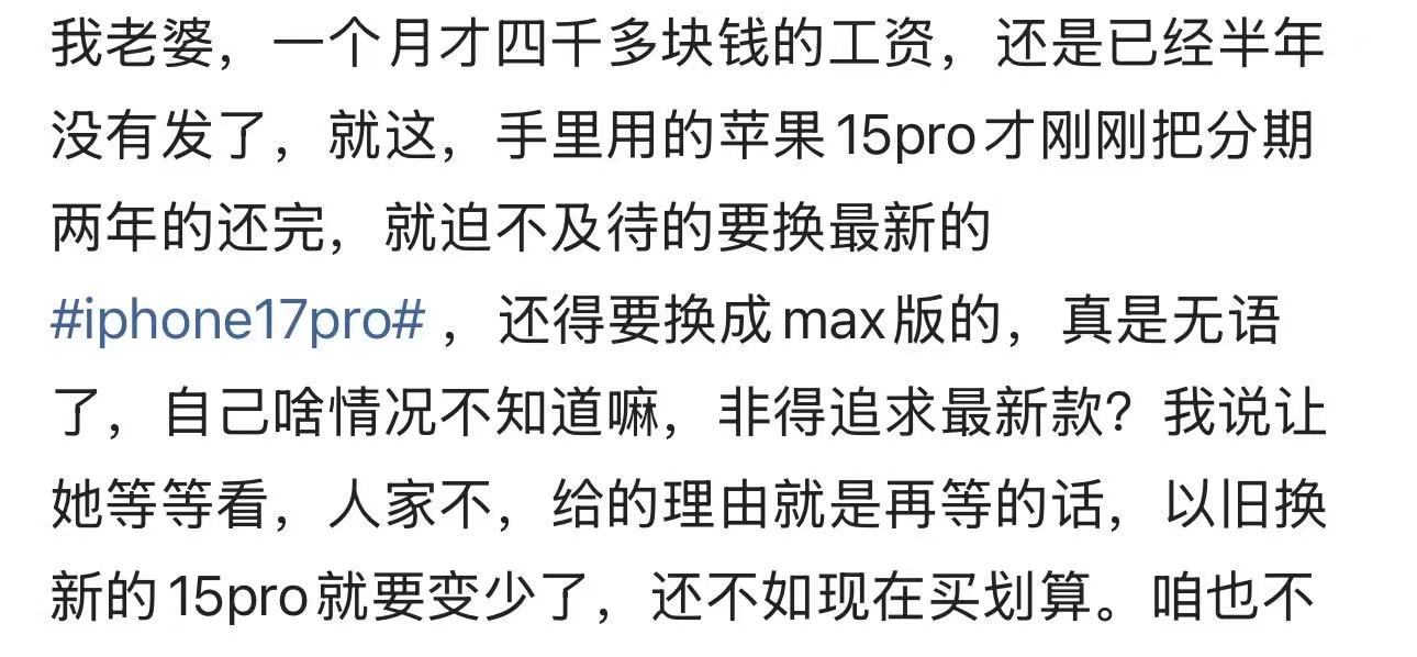 男子吐槽老婆一个月才四千多块钱的工资,却要为了面子硬上phone17pro max,而且她手上还用着15pro,分期两年才刚刚还完,实在无法理解!网友:我老婆也要买苹果17,我不同意,她把家砸了!