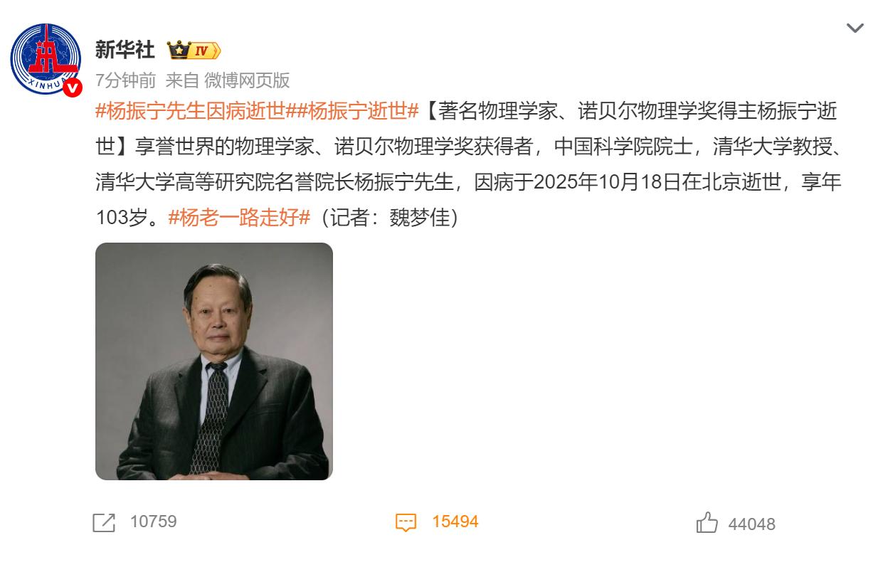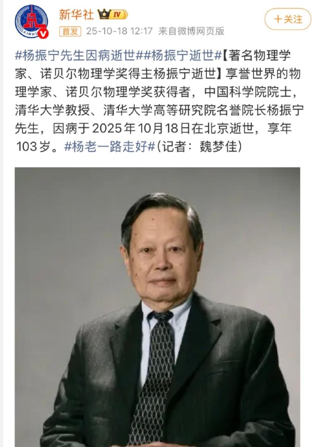 权威媒体发声了,杨振宁真的逝世了。 昨天,就有关于杨振宁逝世的消息传出来,不过都是自媒体发布的,没有可信度,有记者先后联系了施一公,潘建伟,还有杨振宁的好友王征,王征在半个月前,还参加过杨振宁103岁的生日,可这三人口径都十分统一,都称没有收到官方消息,大家不要以讹传讹。 没想到,仅过了一天,谣言就变成了现实,杨老真的去了。 从新华社的消息来看,杨老是今天(18号)才走的,可能昨天身体各项指标已经很不好,这才有了已经逝世的谣言。 相对来讲,杨振宁的身体还是很不错的,百岁老人了, 每次露面精神状态都很好,而且能自主活动。这其中,妻子翁帆功不可没,如果没有他,杨振宁的生活质量应该没有这么高。 如今杨老去了, 最伤心的要数翁帆,杨老曾说,希望他去了以后,翁帆能够再嫁,再次找到自己的幸福。