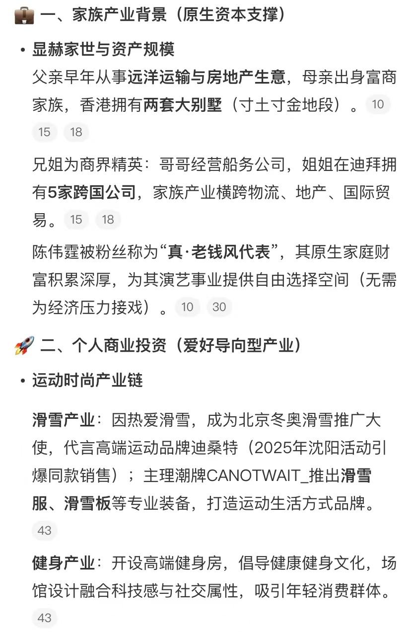 特意去查了陈伟霆的底细,何穗绝对是高攀了! 何穗之所选择陈伟霆,她走的是奚梦瑶的旧路!先来说说陈伟霆的显赫家世,他的爸爸是做远洋运输和房地产生意的,一出生他就是太子爷,而且还是家里年龄最小最得宠的一位,不然也不会让当年的baby和阿Sa都爱上他。而他的妈妈本身就是富商千金,跟陈伟霆的爸爸结婚后家族强强联合。到了陈伟霆这一代,陈伟霆的哥哥接手了家族生意,除了把家族房地产跟船务方面继续做大做强外,又扩展了物流和国际贸易。陈伟霆经商这么有头脑也受了他爸爸和哥哥的影响,还有他那在迪拜拥有5个跨国公司的姐姐。 陈伟霆自从打开大陆的市场后,他除了开高端健身房外,还开了自己的潮牌公司。在香港他还是有公司的股份,在内地混娱乐圈又衍生投资,还投资拍戏,又是各种高奢的品牌代言人,身价早就过亿。何穗一直都很聪明,奚梦瑶嫁给何猷君,秦舒培嫁给陈冠希,都是富二代,何穗嫁给陈伟霆一点也不比她们两位差,成功成为豪门太太。