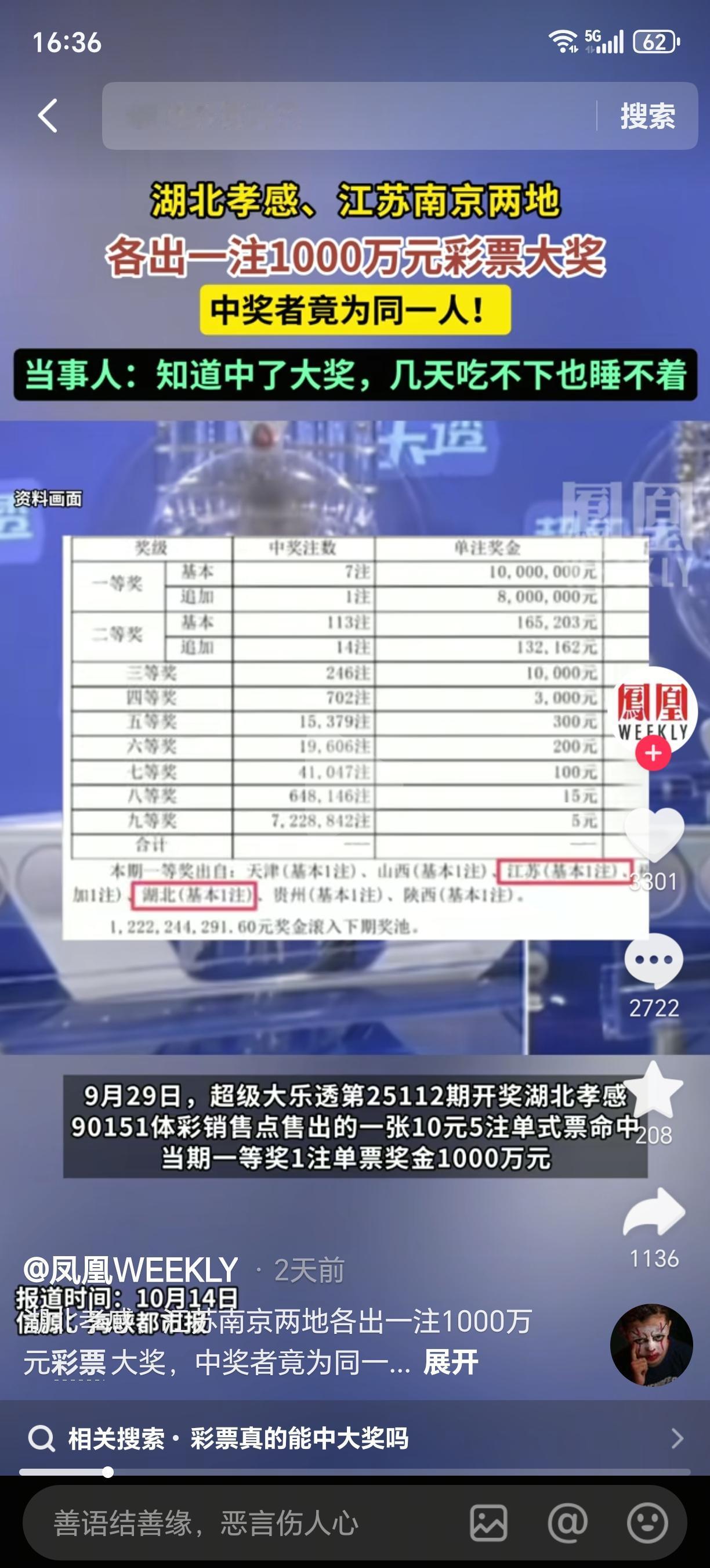 近日,一条彩票新闻可把不少人给惊着了。有个老彩民,先在江苏南京中了1000万大奖,接着又在湖北孝感中了1000万。没听错哈,两个省的一等奖让同一个人给拿下了,奖金加起来整整2000万。而且这人厉害,两天内跑了两座城市,顺顺当当把奖金全领了。 据悉,这位中奖的老哥坚持买同一组号码两年多了,这就是彩民常说的守号购彩法。这期他还让在湖北孝感的姐姐帮忙跨省代买。他平时还有个习惯,一次性买15期,就怕自己忘了或者漏买。 中了大奖后,他自己说,好几天吃不下睡不着,感觉跟做梦似的,压根没想到这么大的奖能砸到自己头上。还说第一次领奖的时候,手一直抖,第二次就镇定多了。说到奖金咋用,他打算先存起来,班照上,慢慢再做打算。 不过网友的评论可有意思了:“信他还不如信我是处女呢!”“这剧情比我中500万还离谱”。说实话,同一组号码在两地同时中头奖,这概率小得可怜。也难怪大家心里犯嘀咕。 我觉着,这事确实太巧了。虽说买彩票本来就是碰运气,但这么巧的事儿,谁心里都会犯嘀咕。不过梁先生说了,奖金先存着,继续踏实上班,这点倒挺实在。 其实大家不是质疑他中奖,就是觉得这过程太像剧本了。彩票本来是公益事业,关键得公开透明。要是总出现这种“神仙剧情”,难免会让彩民心里打鼓。毕竟谁都不想自己的善意和期待最后落个空。 这事儿你咋看?要是你,还会接着买彩票不? 来源:凤凰WEEKLY 2025-10-14