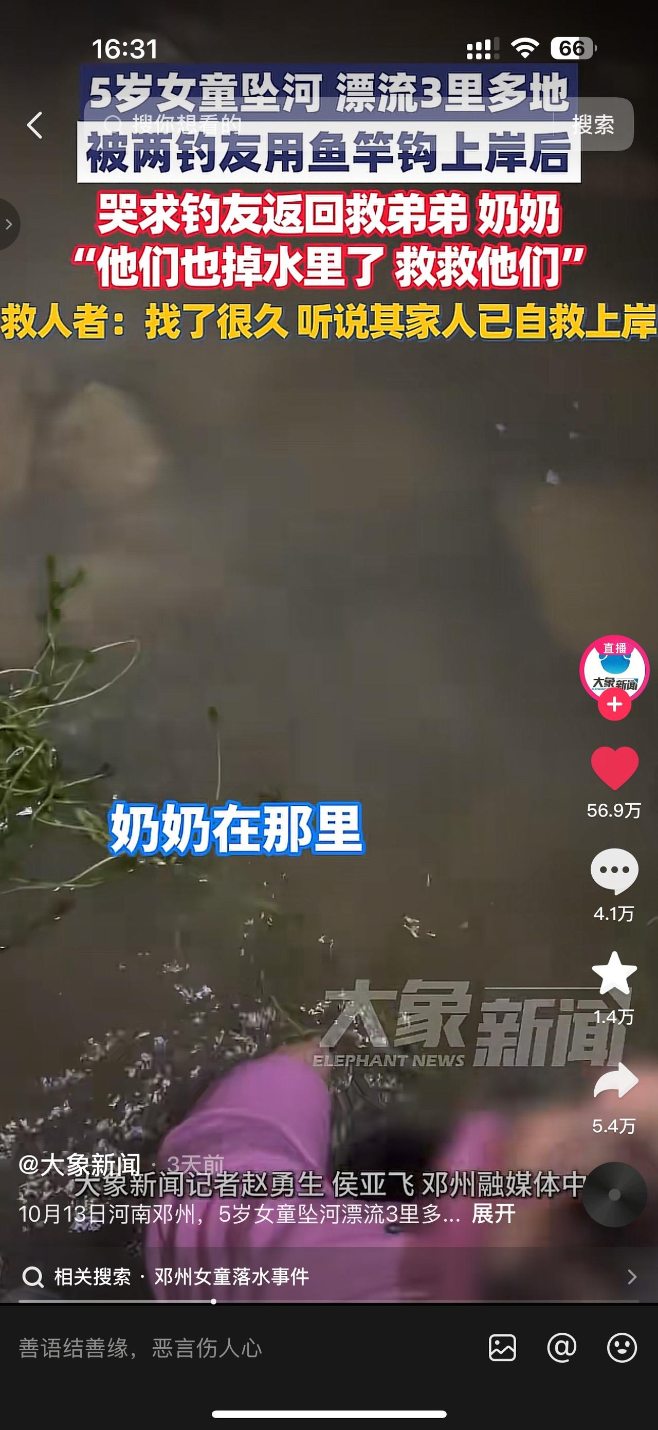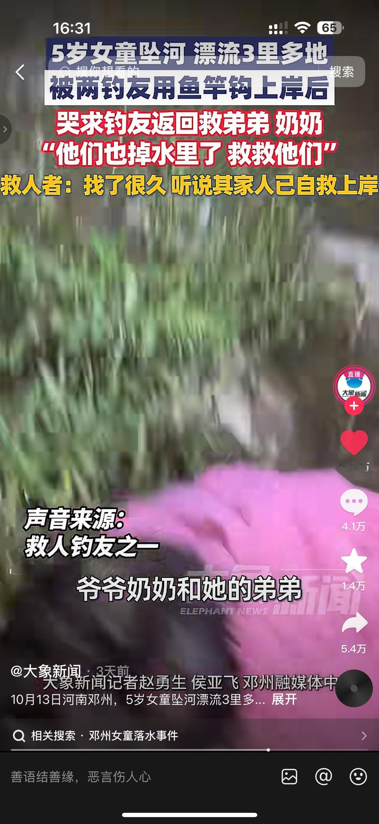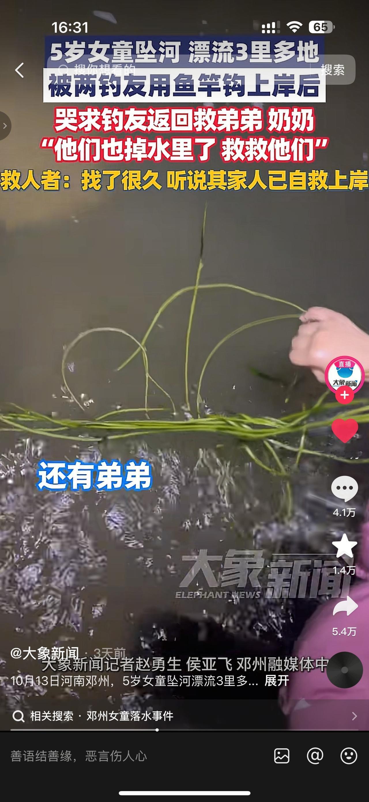 “这是几世修来的福气!”河南邓州,5岁女童坠河,漂流3里多地,被两钓友用鱼竿钓上岸。可是她上岸后的第一件事情,却是哭喊着:“救救我奶奶和弟弟,他们也掉到河里了!”两钓友吓一大跳,连忙报案。这场跨越3公里的生死救援,藏着“见义智为”的智慧与生命奇迹的密码,更牵动着一个家庭的命运轨迹。 邓州市腰店镇湍河御龙湾河段的夜色浓得像化不开的墨。32岁的王佩和28岁的刘力正各自握着路亚竿夜钓,耳边只有水流撞击河岸的哗哗声和鱼竿抛线时的轻微响动。突然,一阵微弱却清晰的哭腔顺着风飘了过来:“救……救命……” “当时什么都看不见,就只能听见远处有哭声,声音还越来越近。”刘力后来回忆道。 两人同时打开头灯朝声音来源扫去,光柱在漆黑的水面上晃动,最终定格在百米外的河中央——“就看见水中间漂着一个东西,定睛一看是一个小孩!” 王佩的心瞬间提到了嗓子眼,他下意识地就要脱外套下水,却被刘力一把拉住。 “这个水流非常急,水情非常复杂,当时我们也不敢轻易下水。”刘力压低声音说。 刚下过雨的河水浑浊湍急,深不见底,两人都清楚,贸然下水不仅救不了孩子,反而会把自己的命搭进去。 对视一眼后,他们同时把目光落在了手里的路亚竿上。 王佩深吸一口气,调整好鱼线轮,将挂着软饵的鱼竿对准女童方向猛地抛出去。可水流太急,饵刚落水就被冲偏了几米。 “我们反复尝试,又怕再次伤害到这个小女孩,不敢用力过猛。”王佩说。一次、两次、三次……连续十几次抛投都以失败告终,要么是距离不够,要么是鱼线被水面漂浮的树枝缠住。 女童的哭声越来越微弱,小小的身体在水面上起伏得越来越小。 王佩额头上的冷汗混着河水的湿气往下淌,他紧紧攥着鱼竿,指节发白。终于,“最后一次终于钩到她的衣服,从河中间把她拉到岸边。” 两人交替着往回收线,鱼竿被绷得笔直,几乎要断成两截。他们小心翼翼地调整力度,像拔河一样与湍急的河水对抗,终于将女童的身体拖到了岸边。 王佩立刻跳下去,一把将浑身湿透的女童抱上岸。“小女孩上来自己也已经吓坏了,”刘力赶紧脱下自己的冲锋衣裹在她身上,又轻轻拍着她的背帮她咳水。 就在这时,女童突然抓住王佩的衣角,带着哭腔喊道:“叔叔,救救我奶奶和弟弟,他们也掉到河里了!” 王佩和刘力都惊呆了,他们赶紧掏出手机报警,同时沿着河岸往下游跑,“救人者找了很久”,却始终没有发现其他落水者的踪迹。后来才听说“其家人已经自救上岸”。 而此刻,在上游几公里的漫水桥边,女童的祖父正疯了一样沿着河岸奔跑。 据邓州蓝天救援协会习队长介绍:“爷爷骑了个车从河床上走的时候,带着她奶奶、弟弟还有小女孩,掉下去了,被冲到下游去了。” 原来,傍晚6点左右,祖父骑着三轮车带着老伴和6个孙辈过桥时,车轮打滑坠入河中。混乱中,他只来得及抓住两个孩子,而“奶奶和弟弟通过自救,已经爬上来了”。 警方和救援队赶到后,沿着湍河展开搜救。令人欣慰的是,两岁的男童很快被找到,他被祖母死死护在怀里,虽然受了点惊吓,但身体并无大碍。 目前,“获救的祖孙四人已被送往医院,接受进一步的检查和治疗,经诊断身体均无大碍”,“四个人的状态都很好”。 救援人员问小女孩:“你学过自救没有?”她说:“我们在幼儿园学过,平躺着不动就行。”这句话让所有人都为她点赞,更“为幼儿园的安全教育点赞”。正是这个简单却关键的自救知识,让她在湍急的河水中保持了冷静,为救援争取了宝贵的时间。 第二天,在医院的病床上,5岁的女童用蜡笔画了一幅画:两个高高的鱼竿,下面站着两个模糊的身影,旁边写着“谢谢叔叔”。 而王佩和刘力的鱼竿上,还残留着女童羽绒服的一小块布料,那是这场生死救援最珍贵的纪念。 这场跨越3公里的生死救援,不仅展现了王佩和刘力“见义智为”的智慧,更让人们看到了生命教育的力量。 同时,它也给所有家长敲响了警钟:临水出行一定要提高警惕,而幼儿园的安全教育,则为孩子们筑起了一道看不见的生命防线。那根创造了奇迹的路亚竿,将永远见证这份危难时刻的善意与勇气。 信源:大象新闻 对此, 您怎么看?欢迎在下方评论区留言, 麻烦您点击一下“关注”和“点赞”方便您下次看到更加精彩的内容,祝您生活愉快,感谢支持。 免责声明: 文章内容以及图片皆来自官方媒体报道或第三方平台, 真实案例整合分享, 对于文章内容如有疑问或侵权行为,请联系本人进行修改或删除! ! !