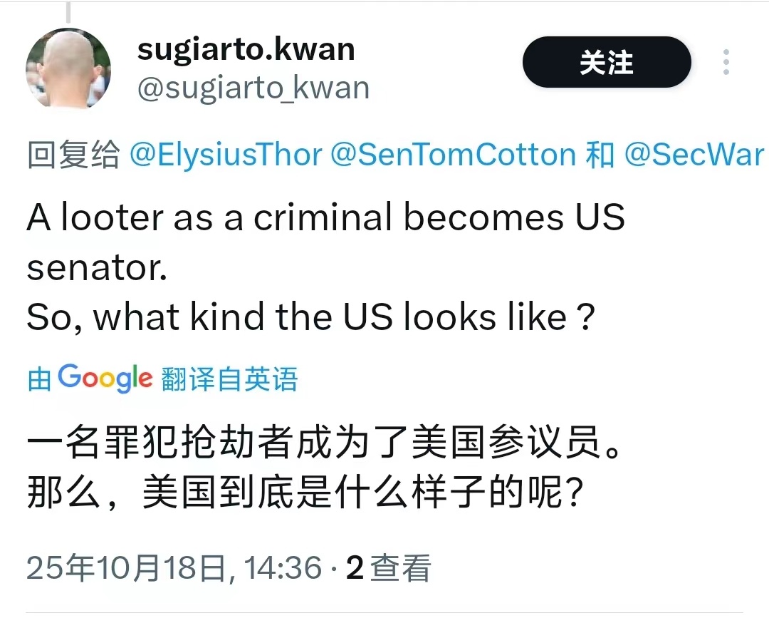 还有网友在其下回复:一名罪犯抢劫者成为了美国参议员。那么,美国到底是什么样子的呢?