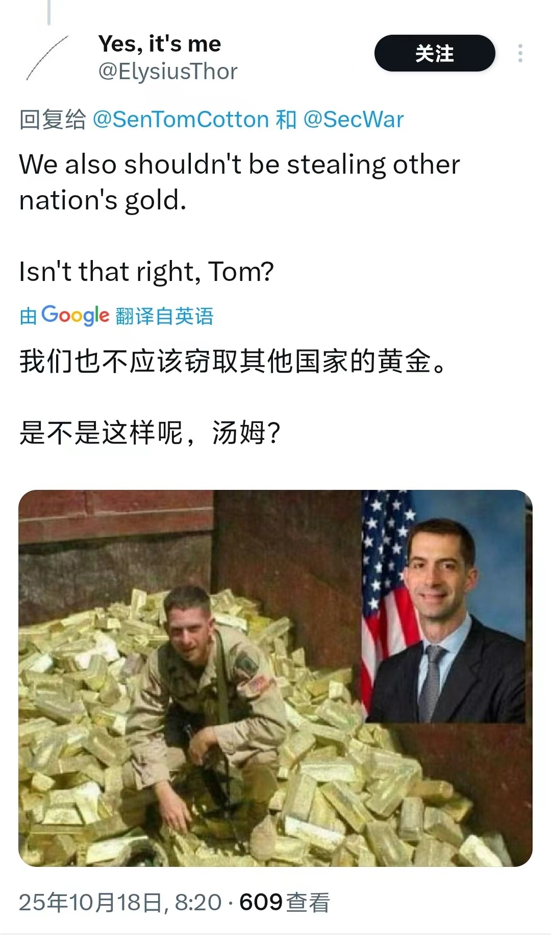 帖子下面最热的一条评论:我们也不应该窃取其他国家的黄金。是不是这样呢,汤姆?[二哈]