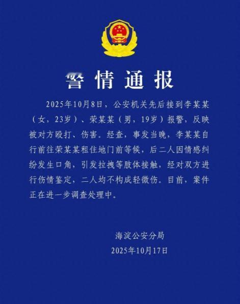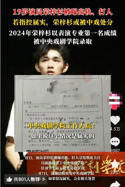 19岁童星被曝塌房!用私密照威胁女性,警方通报来了。 10月17号这天,娱乐圈算是炸开了锅。 一边是台北金钟奖上小S带着姐姐骨灰领奖的催泪场面,另一边北京海淀公安分局的一则通报,把19岁演员荣梓杉推上了风口浪尖。 网友们吵得快掀翻评论区的时候,10月17号北京海淀公安分局的警情通报来了,算是第三方给出的说法。 通报里明确讲,10月8号那天,李禹熹和荣梓杉先后报警,都说被对方殴打受伤。 经查实,当天是李禹熹主动去荣梓杉的租住地等着,俩人因为情感问题吵起来,进而发生了拉拽等肢体接触。 不过核心是,伤情鉴定显示俩人均不构成轻微伤,这案子现在还在调查中。 有意思的是,中央戏剧学院也被卷了进来。 有媒体致电校方,询问对学生陷入这种道德争议的看法,校方表示如果情况属实,会有相关处置。 要知道荣梓杉可是中戏在读的科班生,2006年出生在四川绵阳,2020年才14岁就凭着朱朝阳一角爆红,原本前途一片光明,现在却被这些负面新闻缠身。 现在双方都咬着不放,一个说对方出轨打人,一个说对方造谣骚扰,谁也不让谁。 吃瓜群众们也分成了两派,有人觉得李禹熹拿出了诊断证明和诸多细节,可信度更高;也有人觉得荣梓杉一直以来形象不错,可能是被恶意炒作。 说实话,不管事情真相到底如何,这场风波对荣梓杉的影响已经不小了。 事情得从10月15号说起,23岁的演员李禹熹突然在社交平台发了长文,字里行间全是对荣梓杉的控诉。 两人同为中央戏剧学院的学生,算是师姐弟关系,本以为是圈内俊男靓女的美好邂逅,没想到最后闹得这么难看。 李禹熹说,她和荣梓杉曾经有过一段恋爱关系,可这段感情只维持了不久,对方就开始对她冷暴力,不接电话、频繁失联成了常态。 更让她崩溃的是,恋爱期间荣梓杉还和多名女生保持暧昧,这让她深受打击,一度确诊了中度焦虑和抑郁。 为了证明自己的说法,她晒出了医院的诊断证明,还有报警回执,看起来不像是空穴来风。 最让人揪心的是肢体冲突的说法。 李禹熹提到,10月8号那天,她去荣梓杉租住的地方想沟通清楚,结果两人起了争执,荣梓杉动手把她拎起来摔在地上,进门之前还踹了她一脚。 事后她去医院检查,诊断结果显示头部、胸部都有损伤,还得了非精神病性脑外伤后综合征,医生建议她全休三天。 更离谱的是,李禹熹还曝了个细节,说荣梓杉曾拿她的私密照当微信头像逼她回消息,这简直是拿隐私当武器,想想都让人后背发凉。 还有更可笑的,连两人之前住酒店372块的房费,都是她先垫付的,催了好几次对方才报销。 这些琐碎的细节,反倒让她的指控多了几分真实感。 大家还在猜来猜去的时候,荣梓杉工作室10月16号立马发了声明,一点不含糊。 里面明确说,荣梓杉从来没和李禹熹谈过恋爱,所谓的出轨、动手打人全是假的。 不光否认,工作室还反过来告李禹熹,说她长期骚扰荣梓杉,又是偷拍又是传谣言,严重影响了艺人的安全和心理状态。 现在证据都备好了,已经启动法律程序要追究责任,还把自己的报案回执亮了出来。 这一下双方各执一词,都拿出了报警回执当证据,把网友们看得一头雾水。 有人想起荣梓杉最近正在热播的综艺《花儿与少年》,节目里他偶尔展露的低情商和自我的一面,当时大家都当是少年人的真性情,现在回头看,倒像是给这场风波埋下了伏笔。 曾经那个清冷忧郁的朱朝阳滤镜,算是彻底碎了。 他手上还有《咸鱼飞升》《沙海之门》等待播剧,现在出了这档子事,资源会不会受影响还不好说。 而对于李禹熹来说,如果最后指控被证实是假的,她也得承担法律责任。 这事儿也给所有人提了个醒,感情的事儿最是说不清,但不管爱与不爱,尊重和底线都得守住。 隐私不能随便侵犯,动手更是万万不可。现在案件还在调查中,真相总有水落石出的一天。 只是不知道等事情平息后,那个曾经让观众惊艳的少年演员,还能不能找回自己的演艺初心。 你们觉得这事儿最后会怎么收场?