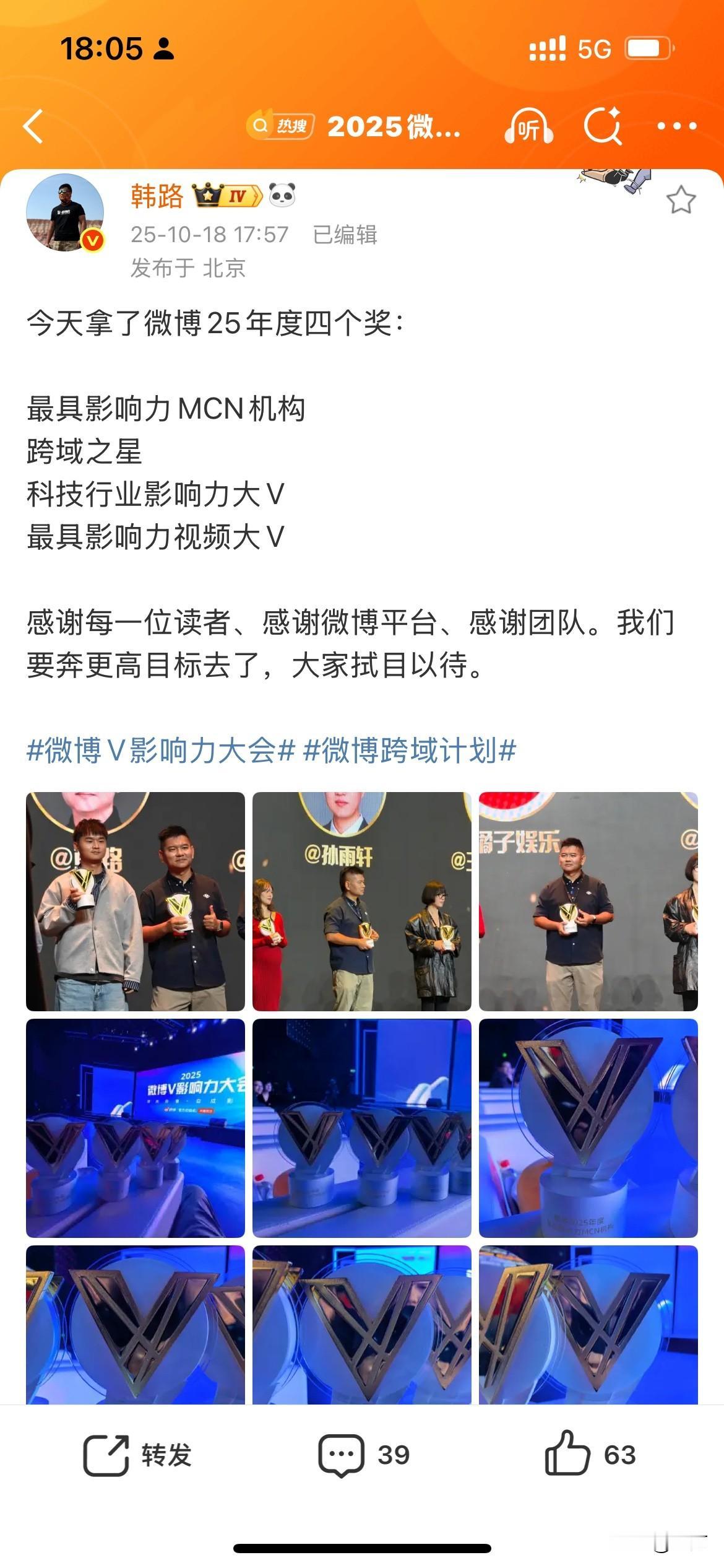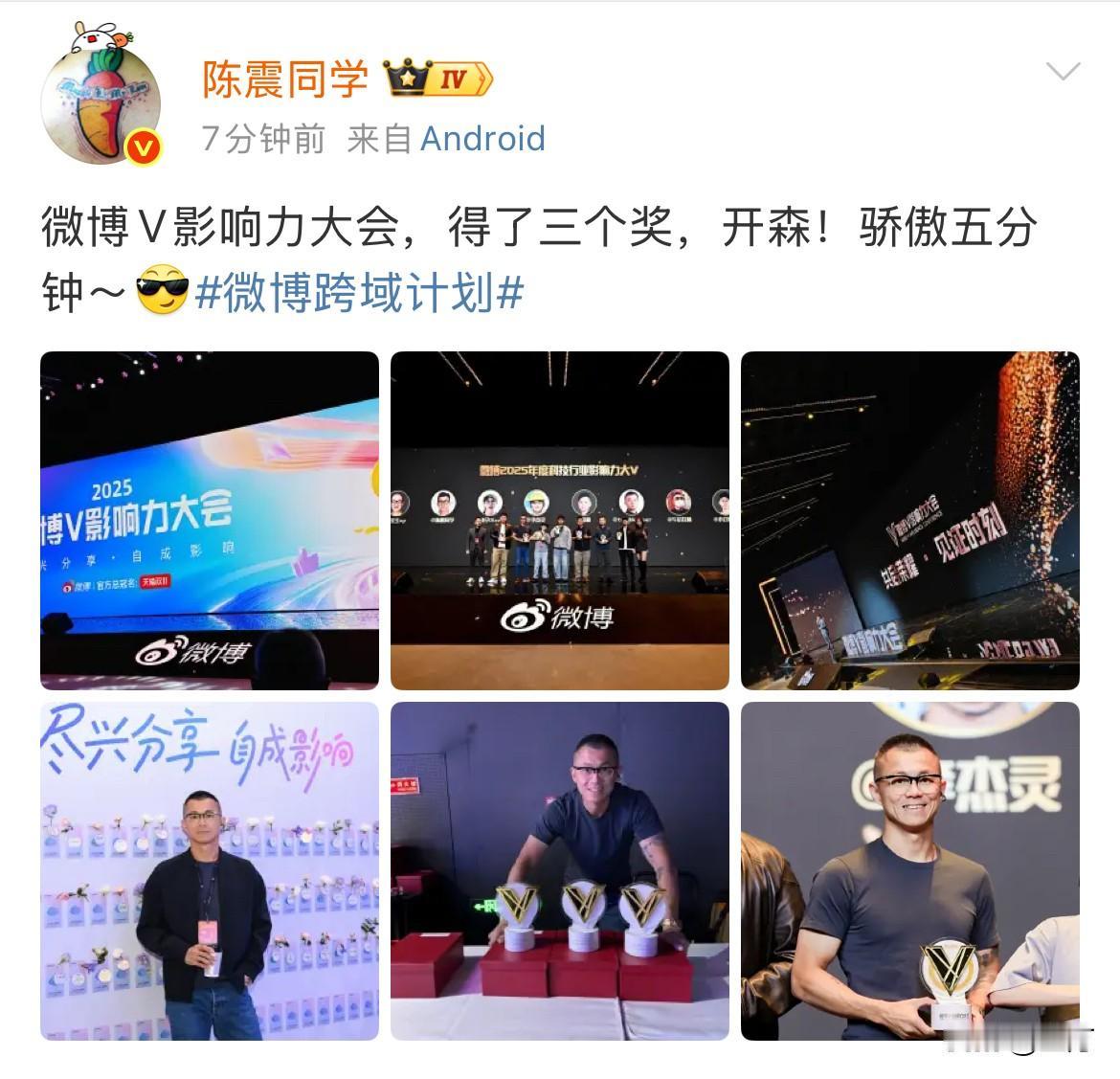 陈震: 得了三个奖 开心! 今天晚上,陈震在社交网络上晒出了,他捧着三个不同奖项的照片!最重要的是第四张照片。 他不但获得了,在汽车博主这个行业有影响力的奖项,而且在跨时尚的行业也获得了奖项,毕竟在一定程度来说,他就是微博这个平台的真正头部博主了。 为什么说第四张照片才是最有意思的,因为他和韩路,至少是在10年以上,或者更长的时间,没有在同一方舞台上出现了。 这次他们中间只隔了两个人,算得上是图文平台的“世纪同框”了。 不过他在网络上,压根就没有提他们两个同桌这件事情,比较有意思的是,韩路的社交网络,也压根没有提过陈震。 他们两个之前约定过,就是在任何时候互相提及,目前看来,他们两个很有默契的,同时遵守了这个承诺。 所以韩路发的照片上主动把陈震剪裁了,这你受得了吗?