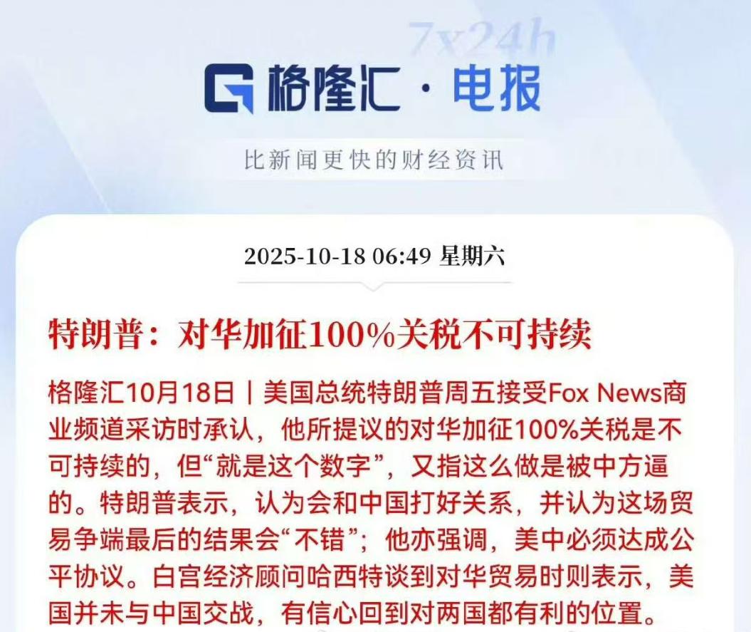 距加税只剩十天,特朗普却认了 “不可持续”,这场闹剧要怎么收场? 最近中美之间的贸易博弈和军事动态被炒得火热,一边是特朗普对关税政策的“口是心非”,一边是美国媒体对航母部署的刻意渲染。 咱们结合各方信息扒一扒,会发现这场看似紧张的对峙背后,藏着不少耐人寻味的真相。 先说说闹得最凶的关税那档子事。 距离11月1日只剩十几天,此前被炒得沸沸扬扬的“对华加征100%关税”突然露出了真面目。 当地时间10月17日,有记者追问特朗普”11月1日,我们就要对中国加征100%关税了,您认为这种措施是否能持续下去呢?”这位美国总统倒是难得坦诚,直接抛出“不可持续”四个字,转头又把锅甩给中国,声称是“被对方逼的”。 这话听着就有点矛盾,既然知道行不通,为啥还要摆出自家的架势?说白了,就是特朗普手上实在没别的牌可打了。 如今再喊100%关税,更像是虚张声势的谈判技巧。 这边贸易战唱得热闹,那边美国媒体又开始炒作军事话题。 《新闻周刊》说的 “华盛顿” 号和 “尼米兹” 号。这两艘航母的长期任务很固定:守在印太地区,专门防着中国。“华盛顿” 号之前调去中东,是迫不得已 —— 以色列和伊朗关系紧张,胡塞武装还在红海搞事。现在巴以停战了,它回归印太也是顺理成章的事。 现在巴以停战了,它自然要回原岗位,这波调动纯粹是常规操作,跟针对中国没啥关系。 美国政府的实际行动也透着心虚。 要知道中美军方的沟通渠道一直没断,真要是想搞事,犯不着费这劲维持对话。 而且五角大楼心里门儿清,自家造舰能力跟不上,短期内根本没底气搞直接冲突,所谓的“航母威慑”更像是给自己壮胆。 其实梳理下来就能发现,特朗普的关税威胁更像是场注定收场的闹剧。 从法律层面看,美国联邦巡回上诉法院早就裁定他征税越权,最高法院11月的第一周还要审议关税合法性,政策能不能落地都是个未知数。 从现实需求讲,中美贸易往来早就深度绑定,美国对中国的稀土、制造业产品有刚性需求,中国也是美国农产品、能源的重要市场,真脱钩了谁都受不了。 现在距离11月1日越来越近,特朗普政府大概率会找个台阶下,就像之前多次暂停关税那样,悄悄搁置100%关税的说法。 毕竟连他自己都承认政策“不可持续”,再硬扛下去,只会让商界怨声更大,经济压力更重。 说到底,这场博弈早有答案:全球化时代,靠关税搞对抗就是死路一条,军事威慑更是虚张声势。 英伟达的市场流失已经给美国敲了警钟,接下来就看特朗普怎么体面地结束这场闹剧。 至于那些炒作出来的紧张气氛,笑笑就好,真要动真格的,美国自己先扛不住。 咱们就接着看戏,看这场贸易大戏最后怎么收尾。