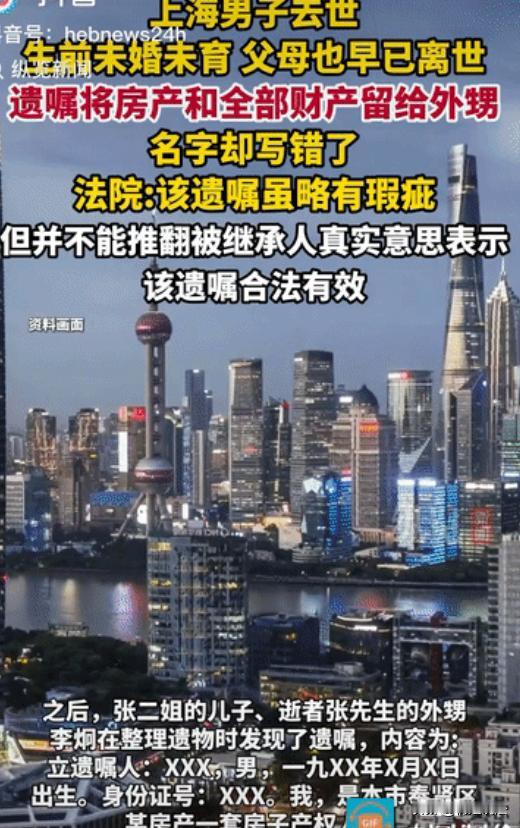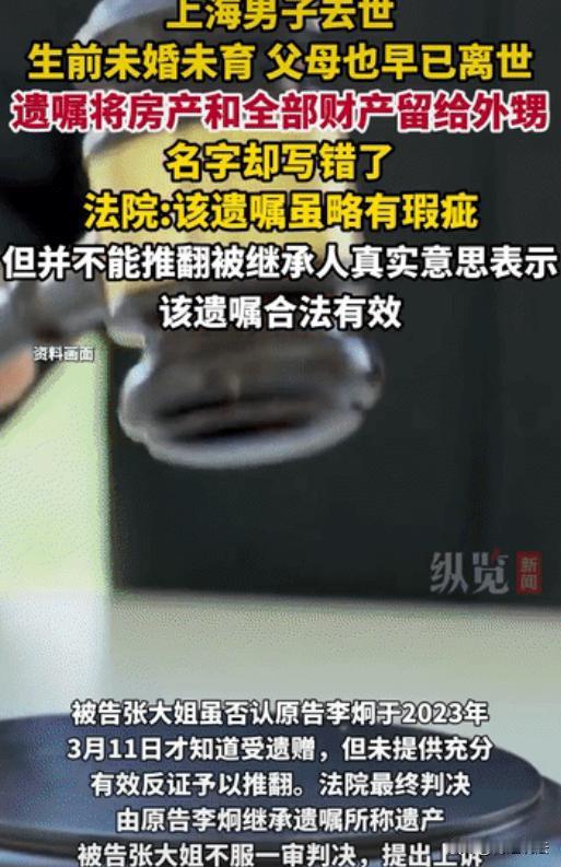 上海,男子孑然一身,离世后遗产由大姐、二姐继承,事后二姐儿子在整理遗物时发现了一份遗嘱,里面写着房产、存单等由他继承。儿子不敢含糊,将遗嘱内容发给了母亲,母亲看完后也很震惊,第一时间转给了大姐。大姐看完后,称遗嘱里名字“炯”错写成“烔”,称呼由“外甥”写成了“外孙”,根本没有法律效力。最终双方对簿公堂,最后的判决亮了。 深圳新闻网十月十七号报道了这则法定继承纠纷的案件,如果遗嘱里名字写错了,称呼也不对上,这样的遗嘱能有效吗? 老张这辈子因为一些特殊原因没有结婚,更没有孩子,父母在他长大后陆续离世,只留他和2个姐姐互相扶持。 后来姐姐陆续结婚后,和老张的往来也没有那么频繁了,好在二姐的儿子李炯和他比较亲,这也给他的老年生活带来些许慰藉。 时间来到二二年五月十九号,老张最终因病离世,留下了房产、股票等财产,算下来是笔不少的钱。 老张离世后两个姐姐作为第一顺位继承人,遗产自然由她们平分。 最终在工作人员的见证下申请了遗产继承公证,老的遗产由两个姐姐继承。 时间来到二三年三月十一号,外甥李炯闲来无事,心血来潮下开始整理起舅舅的遗物时,意外发现一份遗嘱,里面的内容更是让他感动又意外。 原来遗嘱里写着老名下的房产、存单、股票、邮票等所有值钱的东西,去世后由“大外孙李烔”一个人继承。 拿着遗嘱的李炯放声大哭,后悔舅舅在世的时候,没有更多的陪伴他老人家,但关于遗嘱是否公开,他也拿不定主意,毕竟遗产已经分配,现在拿出遗嘱怕不是要引起纠纷。 两天后坐立难安的李炯,还是和母亲(二姐)坦白了遗嘱的事情,并且内容发了过去。 二姐看到消息后也沉默了,但当天还是遗嘱的内容发给了大姐。 果然,大姐看到遗嘱后第一时间就是怀疑,这遗产都分完好几个月了,现在莫名其妙的来一份遗嘱,这叫什么事。 在看到遗嘱的内容后,大姐更是不能忍受,毕竟按照遗嘱的规定,这大部分财产就由外甥继承了,这也太不公平了.. 大姐的怀疑倒也是人之常情,毕竟遗嘱这么重要的事情,弟弟之前没和任何人提过,现在过去了几个月后,突然出现了一份这样的遗嘱,想想都不对劲。 仔细检查后果然被大姐发现了异常,原来“外甥”被错写成“外孙”,“李炯”更是被写成“李烔”,落款日期也不对劲,这份遗嘱就不该有效。 大姐在咨询后法务人生后,得知遗产继承的有效期是60天,这下子悬着的心终于放下了。 李炯则觉得遗嘱本来就是真实有效的,更是舅舅真实意思的表达,自己也是最近几天才找到遗嘱的,和那个所谓的60天有效期压根没有关系。 终于,原来还算和睦的姐妹两人,最终因为遗产的分配对簿公堂。 那么,从法律角度,如何认定这件事? 1、如何评价外甥的行为? 《民法典》第一千一百二十四条规定:继承开始后,继承人放弃继承的,应当在遗产处理前,以书面形式作出放弃继承的表示;没有表示的,视为接受继承。受遗赠人应当在知道受遗赠后六十日内,作出接受或者放弃受遗赠的表示;到期没有表示的,视为放弃受遗赠。 如果继承人确定放弃继承,需同时满足两个条件:时间限制:必须在 “遗产处理前” 作出表示);形式要求:需以书面形式作出,口头表示无效。 本案中得知外甥在二三年三月十一号才发现一直,两天后就通知了母亲和大姨,这意味着外甥没有放弃继承遗产的想法,表明的自己想要继承的态度。 2、如何判定遗嘱的内容是否有效? 《民法典》第一千一百三十四条规定:自书遗嘱由遗嘱人亲笔书写,签名,注明年、月、日。 因自书遗嘱无见证人在场,必须通过严格的形式标准防范伪造、篡改风险,其法律效力取决于需同时满足三个法定要件:(一)全文必须由遗嘱人亲笔书写;(二)必须由遗嘱人亲笔签名,仅盖章或捺指印无效;(三)必须注明年、月、日。 本案中老张留下的遗嘱,满足了上诉3个条件,只是里面的名字“李炯”写成“李烔”,称呼“外甥”写成了“外孙”,具体法律效力。 3.判决结果: 审理过程中,考虑到老张的受教育程度和发音上差异,且关键的一点是老张未婚,不存在所谓的外孙,亲戚方面也没有李炯名字相近的人,这种错别字只要不影响理解老张想让外甥继承财产的想法,就是合法有消息的。 最终认定遗嘱里“大外孙李烔”,实际上就是外甥李炯,符合老张的真实意愿,遗嘱是合法有效的。 最终判决:由外甥李炯继承遗嘱里的全部遗产。 大姐不服,提起了上诉。 二审认为一审事实清楚法律适用得当,驳回了大姐的全部诉求,维持原判。 那么,对于这个判决结果,你是怎么看的呢?