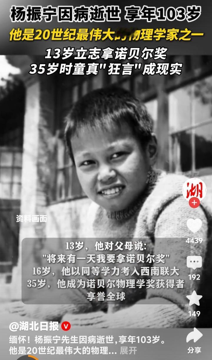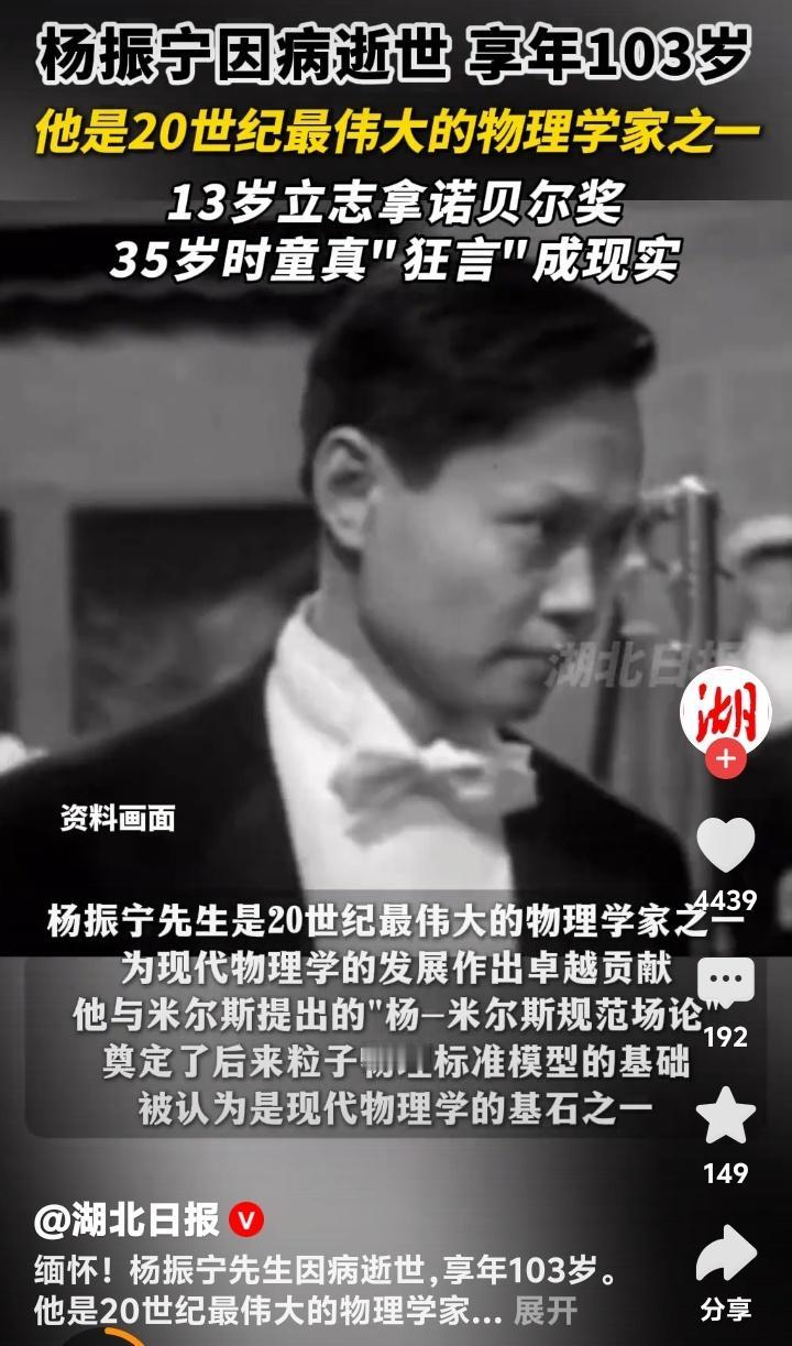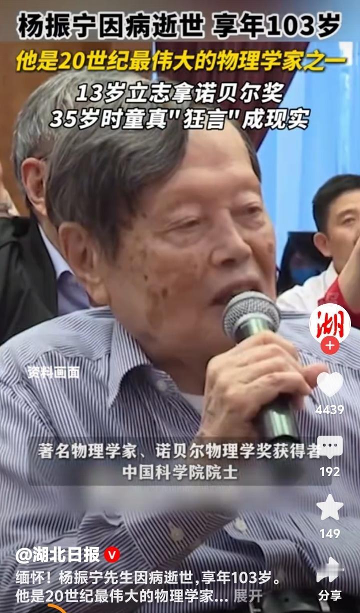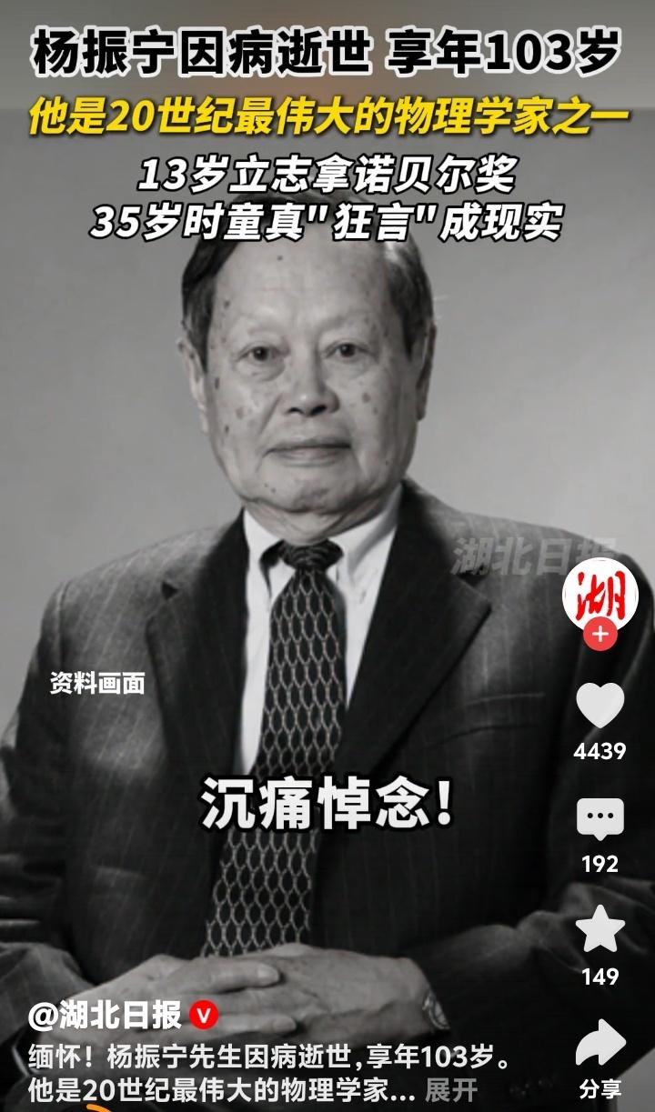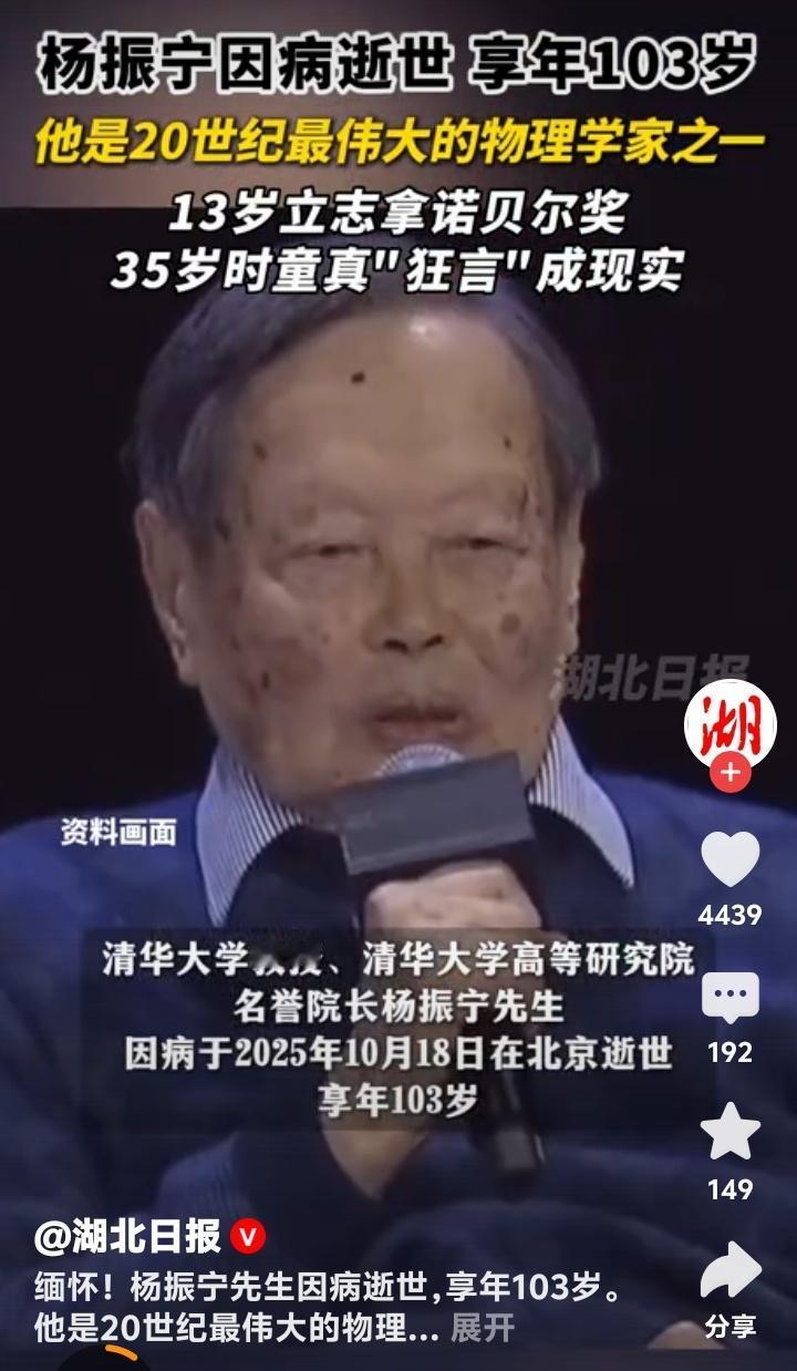 杨振宁103岁传奇落幕!13岁狂言要拿诺奖的安徽少年,如何用一粒沙撼动宇宙?清华大学痛别最后一位科学巨匠 (杨振宁病逝于北京,享年103岁,2025年10月18日12:00时) 当清华园的银杏叶又一次金黄,一位跨越世纪的老人悄然合上了他103年的人生篇章。杨振宁,这个名字曾照亮物理学的星空,如今化作人类文明史册上永不褪色的一笔。13岁那年,他对父母许下“将来要拿诺贝尔奖”的童言,谁曾想,22年后竟一语成真。 1957年的斯德哥尔摩领奖台上,35岁的杨振宁与李政道并肩而立,成为最早让诺贝尔奖刻上华人名字的科学家。但鲜少有人知道,这份荣耀背后藏着一场惊心动魄的学术革命——他们提出的“宇称不守恒”理论,曾让爱因斯坦都摇头质疑,却最终重塑了人类对宇宙本质的认知。 若说诺奖是他人生的高光,那么“杨-米尔斯规范场论”便是他留给世界的无价遗产。这个看似晦涩的理论,如同暗夜中的灯塔,指引后来者构建出粒子物理的“标准模型”。物理学家们感叹:“麦克斯韦方程描摹电磁,爱因斯坦方程解读引力,而杨振宁的方程,揭示了万物之力的底层密码。” 然而,科学巨匠的内心深处,始终涌动着家国的暖流。1971年,当中美学术冰封未融,杨振宁冒着风险踏上归国旅程,成为打破僵局的“破冰第一人”。他四处奔走筹款,资助近百名中国学者赴美深造。这些学者归国后,多数成为中国科研的中流砥柱,两院院士名单上处处可见他播下的种子。 世人常津津乐道他82岁与28岁翁帆的婚姻,却忽略了他用余生践行的承诺。1997年,75岁的他毅然放弃美国优渥待遇,回归清华园重建高等研究院。耄耋之年仍坚持每周授课,用颤抖的手在黑板上推导公式。学生回忆:“他总说‘宁拙毋巧’,提醒我们科学没有捷径,就像他一生走过的路。” 杨振宁的晚年,像一部浓缩的中国近代史。他见证过战火中的西南联大茅草屋,也参与过普林斯顿高等研究院的巅峰论道;他曾在诺贝尔奖台上接过荣誉,更在清华园里为年轻学子点亮星火。秘书透露,直到临终前,他病榻旁仍放着一本《唐诗三百首》,最爱吟诵杜甫那句“文章千古事,得失寸心知”。 103岁的人生落幕,留下的是70余篇奠基性论文、3项诺奖级成果,以及一段横跨物理、教育、中西文化的传奇。有人说,杨振宁的离去带走了一个时代,但他亲手点燃的火种,早已在无数年轻人心中燎原。正如清华悼文所言:“他的生命不是熄灭的烛火,而是汇入银河的恒星。” 今夜,当我们将目光投向深邃夜空,或许会想起这位老人曾说过的:“物理学的美,在于用最简洁的公式解释最复杂的宇宙。”而他本人,何尝不是用最朴素的心,书写了最浩瀚的人生? (来源:清华大学新闻与传播学院、中国科学院官网、杨振宁访谈录《曙光集》 103岁 杨振宁传奇落幕杨振宁传奇的一生 杨振宁,翁帆杨振宁诺奖 杨振宁和邓稼先,谁更值得国人敬佩 杨振宁对中国的伟大贡献无人可比么 科学巨匠 永垂不朽 家国情怀 一路走好