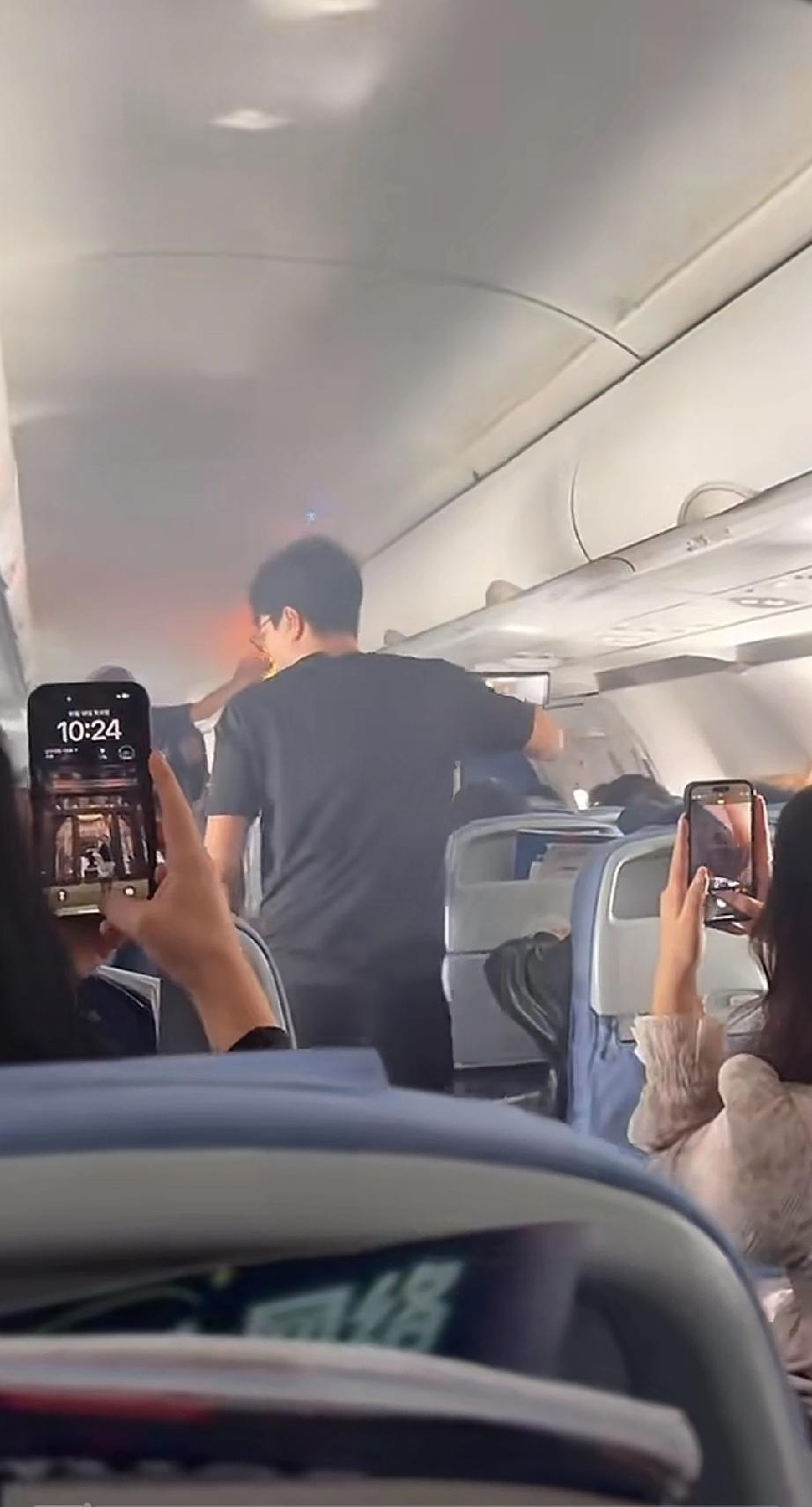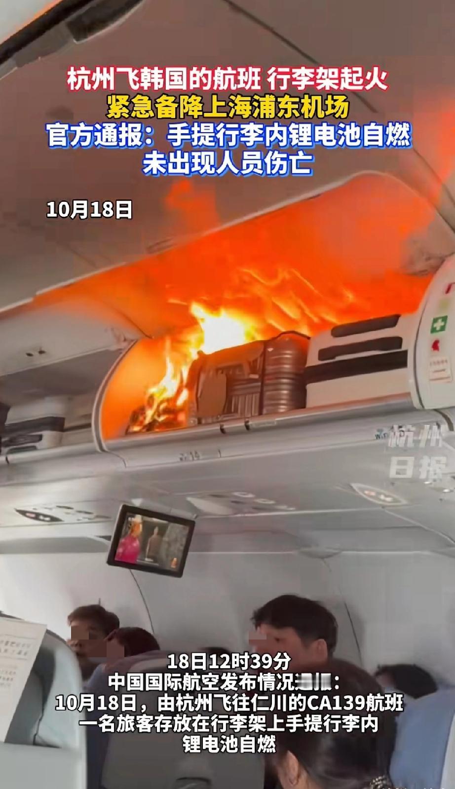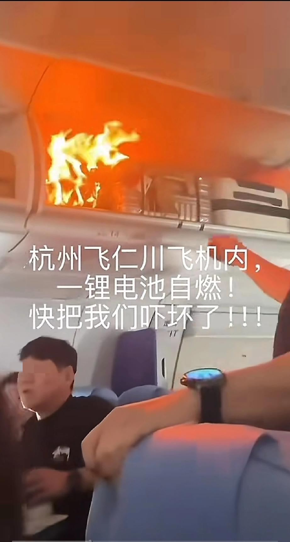 乘客好淡定的拿起手机先拍视频[捂脸]。 杭州飞仁川飞机仓内起火,我看这些乘客,哪怕是头顶上着火的那些乘客,都没怎么逃跑,非常淡定的等待乘务员来处置。 乘务员也是训练有素,很快就灭火了,还好有惊无险。 这里还是提醒大家,起火的是锂电池,大家买充电宝啥的,都一定要买大品牌。