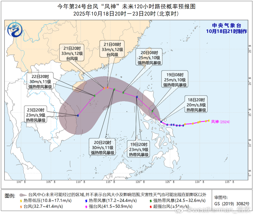 台风风神 明天台风风神将穿过菲律宾吕宋岛,明晚可能进入南海。21日以后因为冷空气的压制,路径会大角度折向西南。除非冷空气大幅调弱,否则不会登陆我国。这次台风+冷空气,会使得东海、台湾海峡、南海北部出现大风天气。台湾海峡还有地形的狭管效应,大风强度可能不亚于台风中心附近。