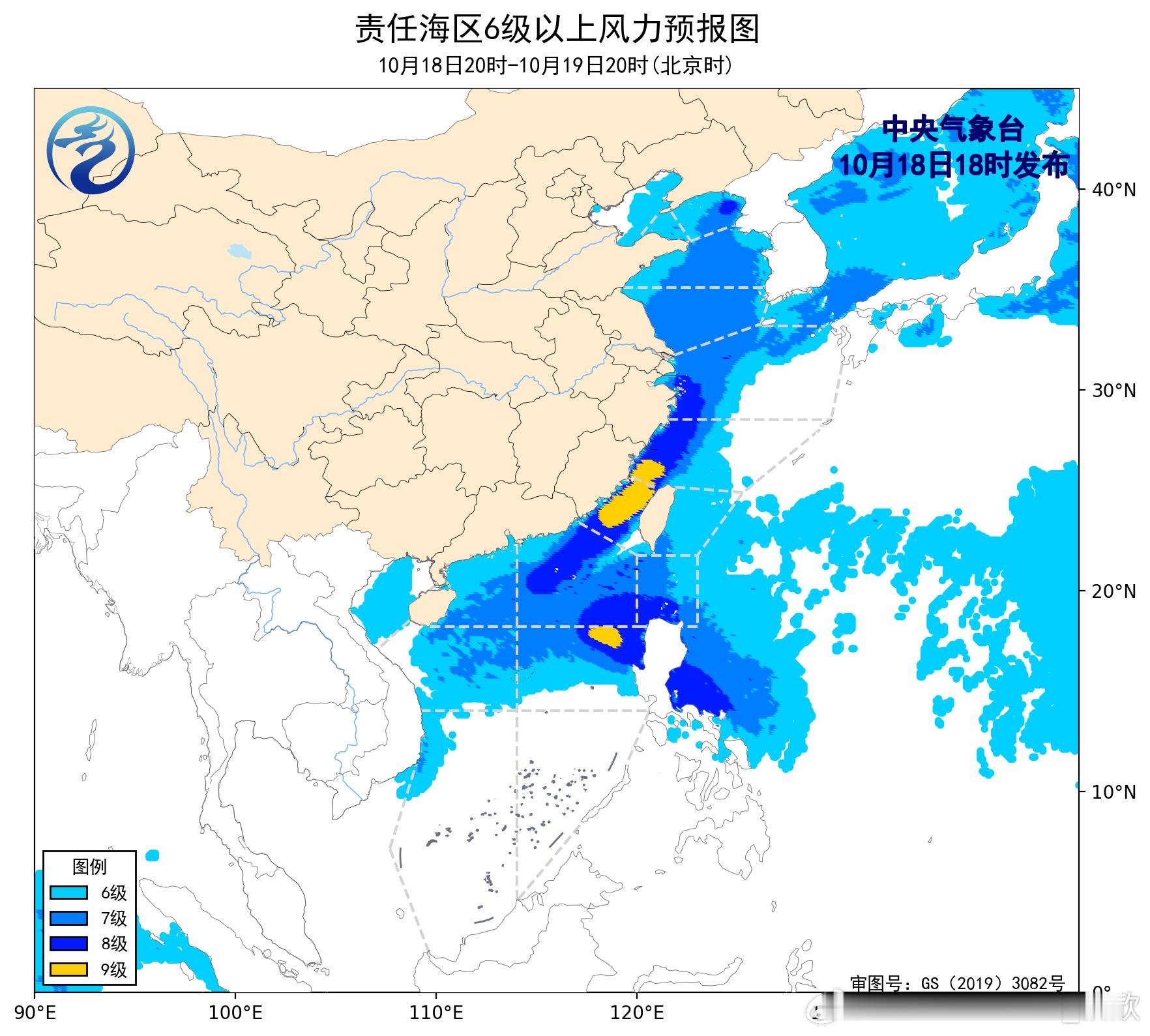 预计,10月18日20时至19日20时,黄海大部海域、东海西部海域、台湾海峡、台湾以东洋面的部分海域、巴士海峡、南海北部和中部海域将有7~8级、阵风9~10级的大风,其中东海西南部海域、台湾海峡、南海中东部的部分海域可达9级、阵风10~11级。
