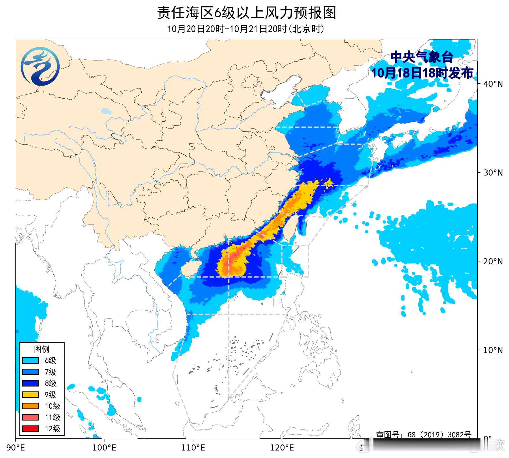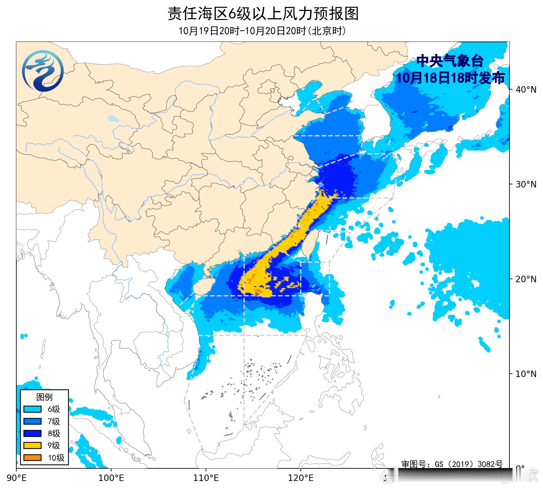 10月19日20时至20日20时,黄海大部海域、东海西部海域、台湾海峡、巴士海峡、南海北部和中部海域、北部湾将有7~8级、阵风9~10级的大风,其中东海西部海域、台湾海峡、南海北部的部分海域风力可达9~10级、阵风11~12级。