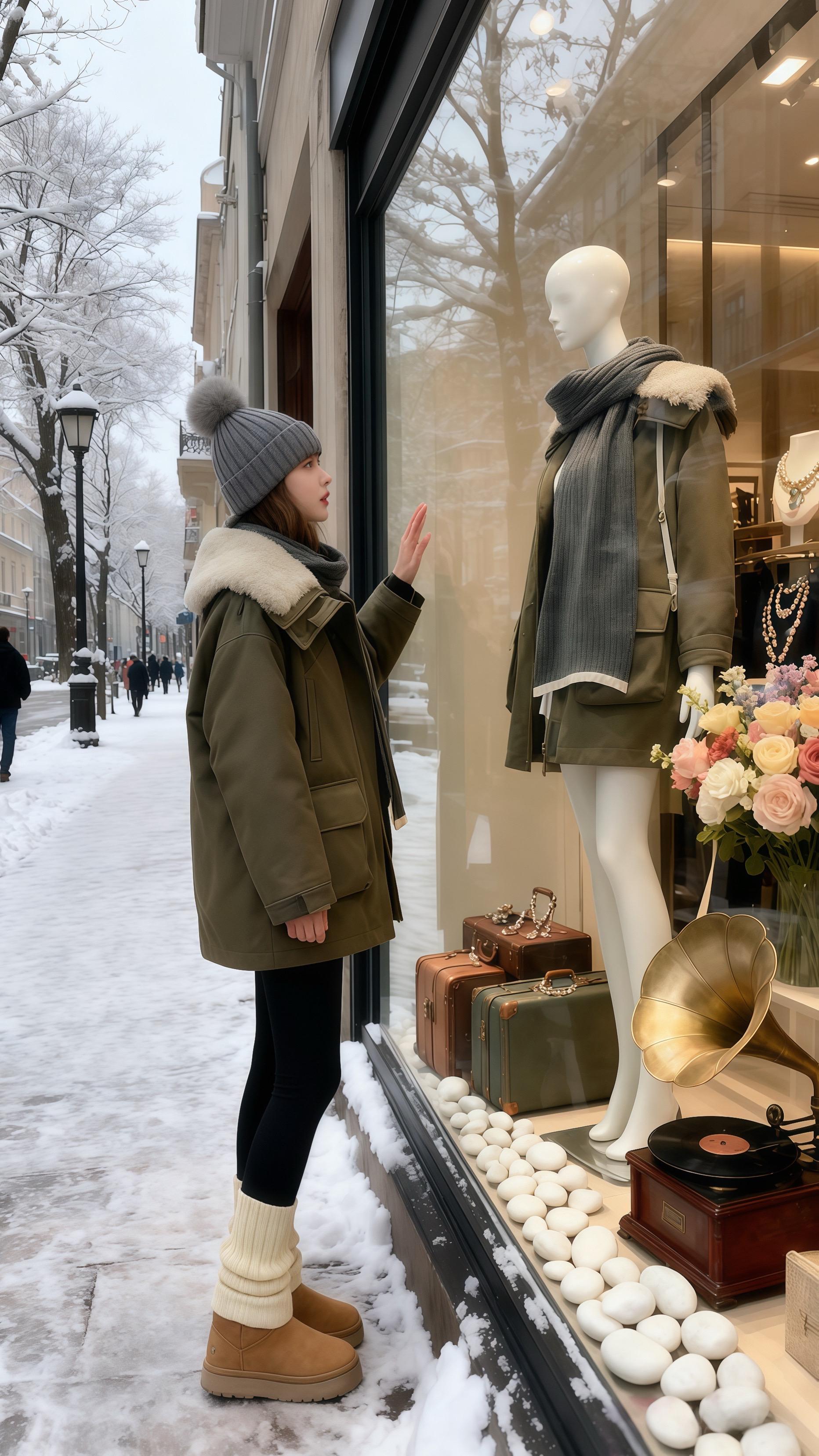 雪天里的“军绿”心动 她把冬日穿成了浪漫。初雪那天,林微在橱窗瞥见那件军绿色派克服,毛绒领像揉碎的云朵,一下撞进她心里。戴上灰色针织帽、围上同色系围巾,踩一双奶茶色厚底靴,她站在雪地里,与橱窗里的“另一个自己”遥遥相望。
