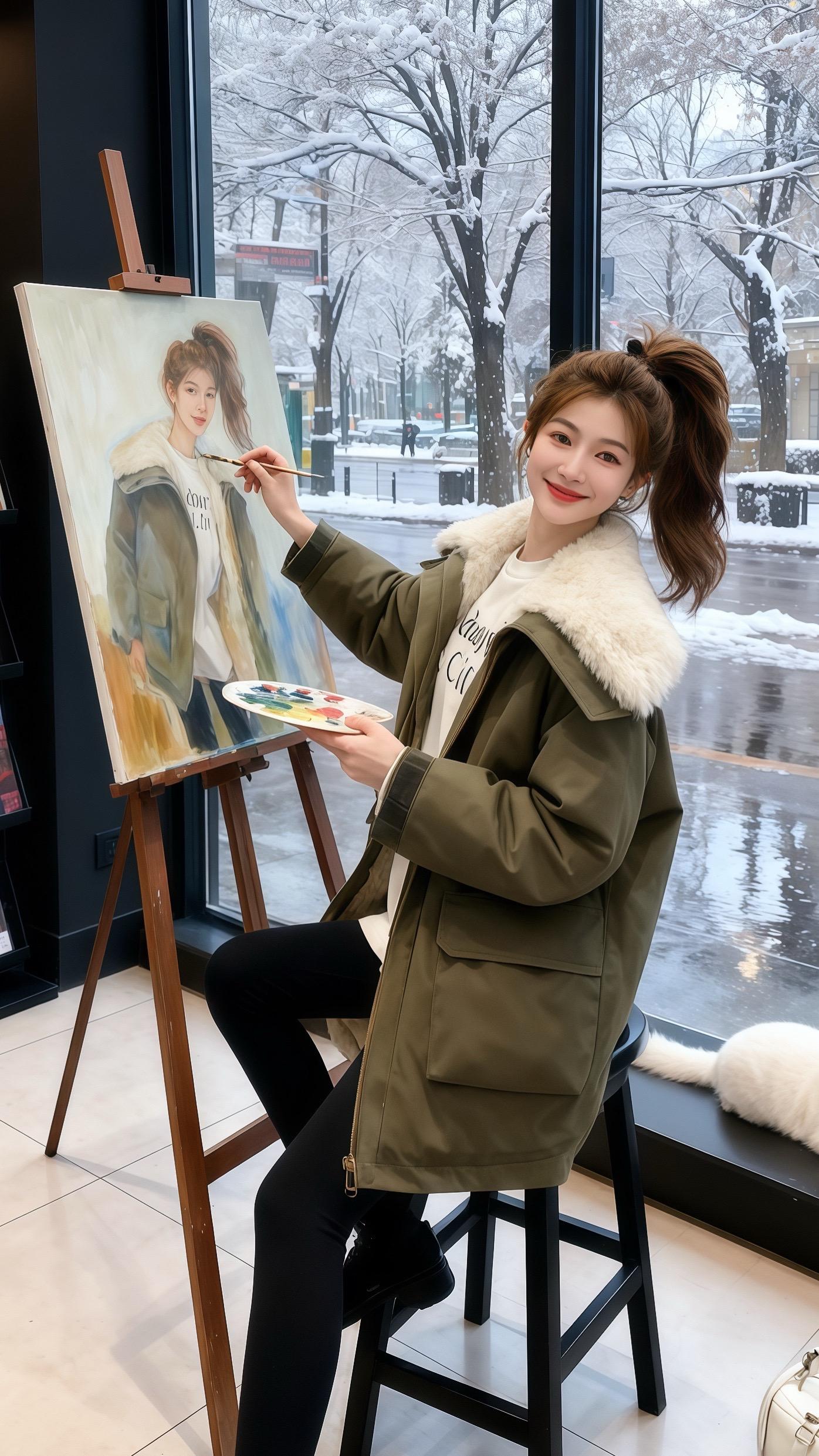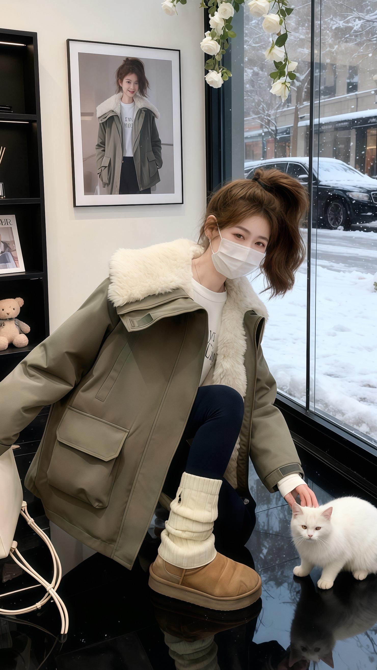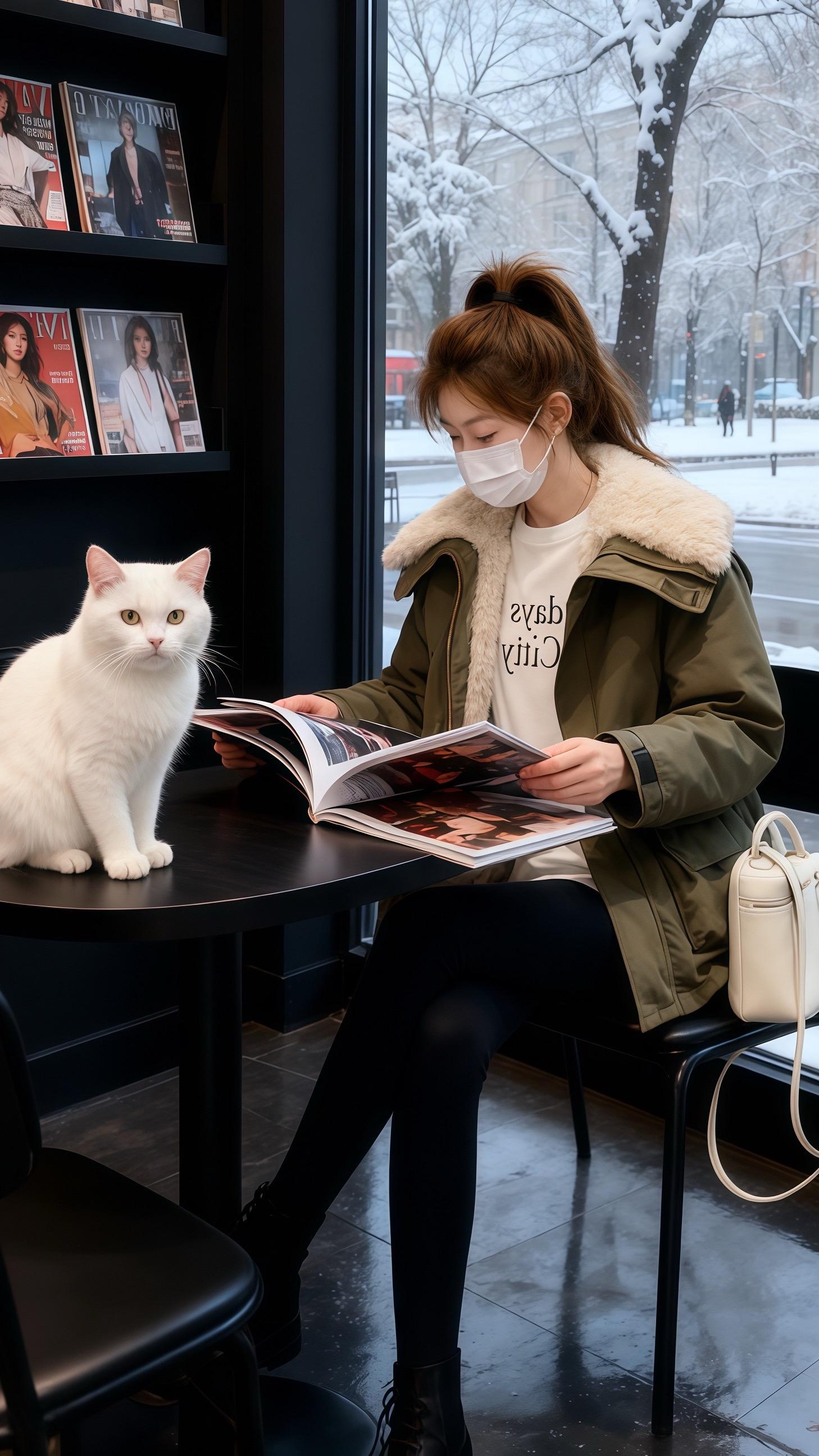 后来,她穿着这件外套去画室,马尾高高束起,握着画笔在画布上复刻这份心动。再后来,她戴着口罩,在暖烘烘的店里撸着白猫,军绿外套衬得她温柔又俏皮。就连在咖啡馆看时尚杂志时,这件外套也成了吸睛焦点,身旁的白猫都忍不住多瞧两眼。
