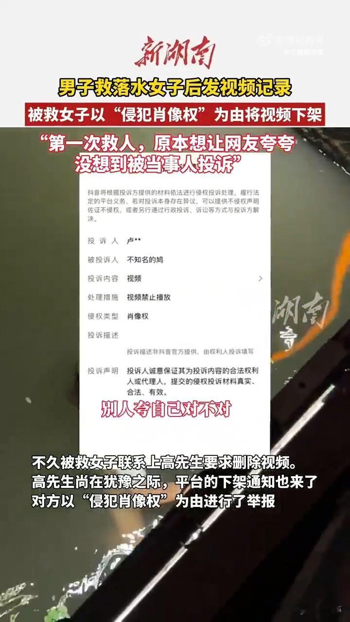 见义勇为的男子勇救落水者,发布了救人的原始视频后,却被投诉侵权肖像权被平台下架删