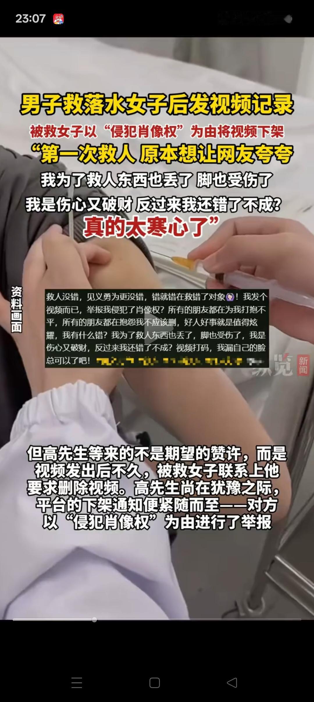 “真是太寒心了”[流泪],浙江,男子好心救起落水女子后,把视频打码发到网上想让大家夸夸他。没想到,女子居然向网站投诉,要求下架视频,理由是侵犯了她的肖像权。 男子很委屈,表示自己的视频打码了,只有自己是露脸的。且自己为了救她还受伤了,花了大几百块钱,好兄弟们也替他鸣不平。 这个视频我看了,全程确实看不到女孩的脸。但是又一想,女孩可能不知道他是救自己的人,要面子好像也能理解。 但希望被救的女孩看到消息后,能给救人的男子打个电话,道个歉,再谢谢他,不要寒了好人的心啊[祈祷][祈祷]