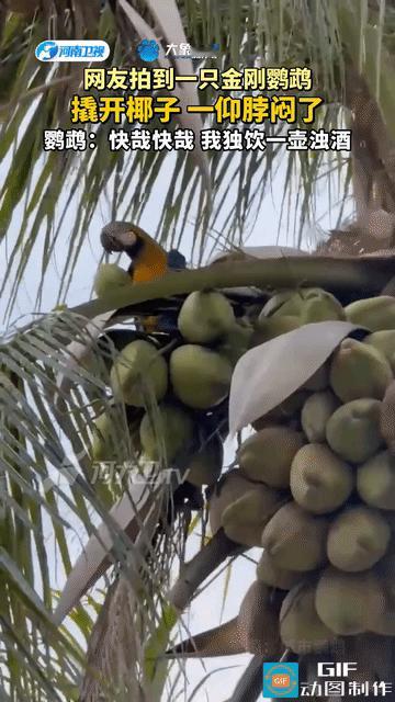 网友震惊了:一网友无意拍到一只金刚鹦鹉在椰子树上,用嘴巴撬开椰子,然后叼起来,一