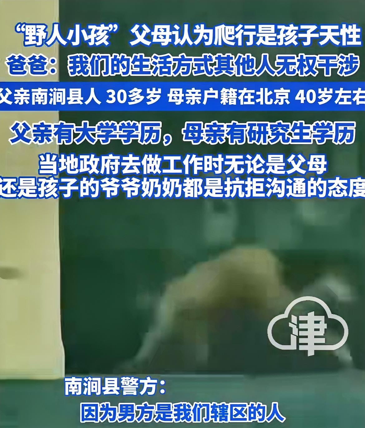 震惊!三岁孩童竟然光着在地上爬! 看到一个视频, 在某高速服务区看到一个小男孩光身在地上爬! 当时在服务区,警察和群众就对孩子的父亲进行盘问, 男子表示家里的事儿,外人管不着! 后高速公路警察联系上男子户籍地的警察, 引起了当地警方的重视。 这也太变态了, 感觉要不是精神病,要不就是非亲生, 孩子的父母都是高学历, 母亲还有北京户口, 但孩子这么大了, 竟然没报户口! 太奇怪了! 希望能调查出具体情况吧, 等警方通报了! 小孩 爬行 父母 儿童