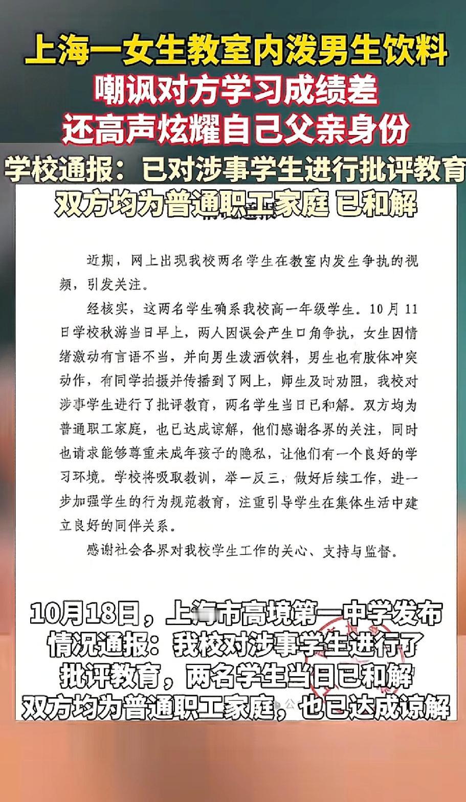 上海市高境第一中学,发布一则通报引起关注。 有一名女生和男生因误会产生口角,并且有肢体冲突。女生在教室里泼男生饮料,还嘲讽对方学习成绩差。 “像你这样的中专生,大专生有资格跟我说话吗?你知道我爸爸是做什么的吗?”女生对男生歇斯底里的说道。男生起身回击勒住女生脖子,经同学劝阻拉开二人。 后来被传到网上引起热议,有网友说:“女生向男同学泼饮料的时候怎么没见后面几个男生拉架?明显是大姐大带几个小弟来霸凌的。将男同学惹急了,又来拉偏架。” 能是同一所高中,大家都是一样的,不要歧视任何人。现在是人人平等。你觉得女生的行为对吗?为什么女生会说出这样的话来? 对此你怎么看?