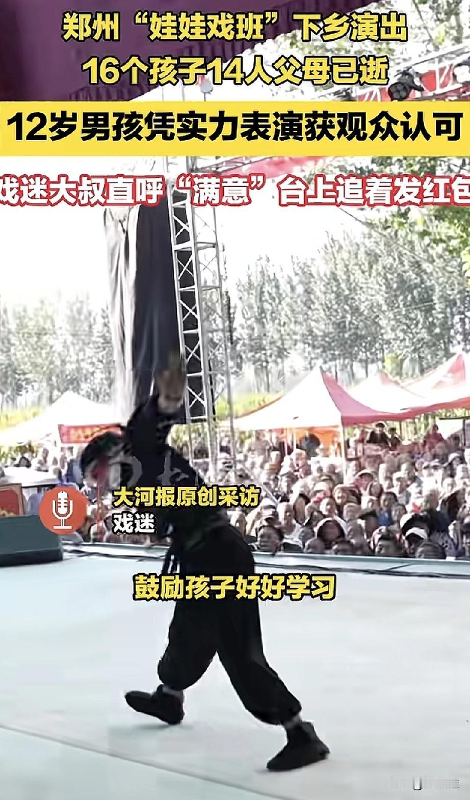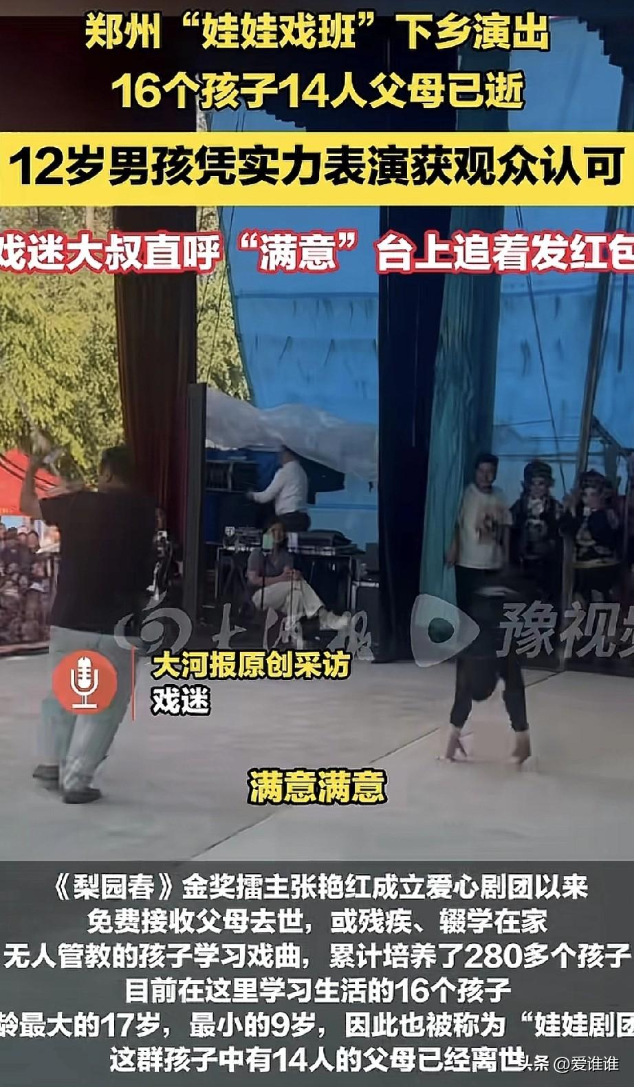河南郑州有个“娃娃戏班”,里面16个孩子里有14个是无家可归的孤儿,他们父母已经逝世,令人十分心疼。这个剧团是个爱心剧团,团长是《梨园春》的金奖得主张艳红,剧团从成立到现在把许多孤儿,或者有轻微残疾,或者不好管教的孩子培养成成材!现在团里的16个孩子个个身怀绝技,他们的演出获得了观众的认可,有的戏迷上台追着给他们发红包,这是对他们演出的最大奖赏!但是有人却质疑有些孩子是不是被拐卖的,我觉得他们的质疑有些道理,因为戏曲学习是一条非常艰难,需要付出极大的努力,一般的父母是不舍得自己的孩子去吃这份苦的。但这些孩子确实是无家可归的孤儿,学习戏曲虽然辛苦,但却可以成为自己安身立命的本事!
