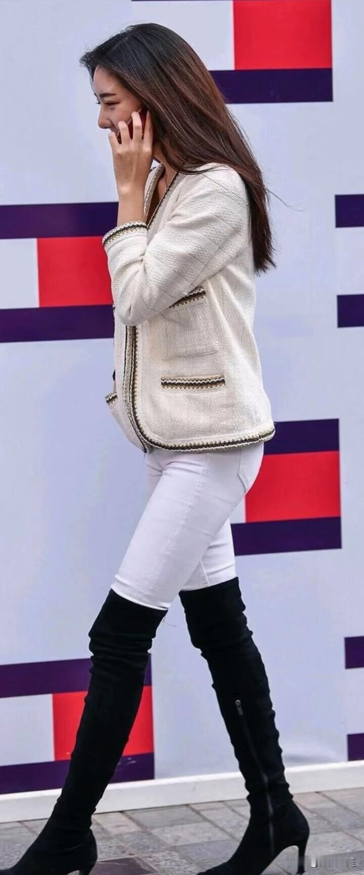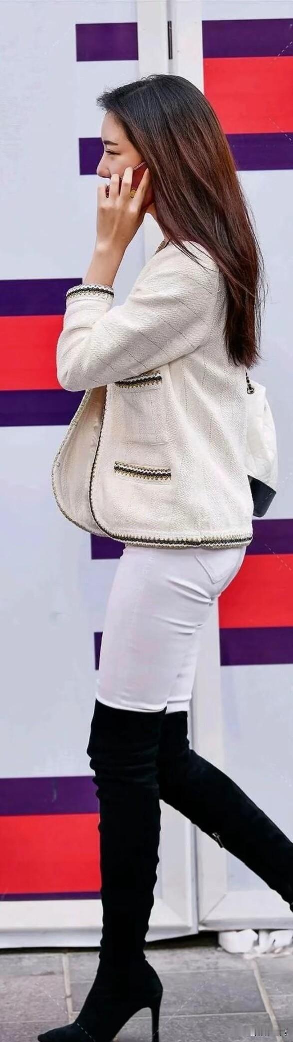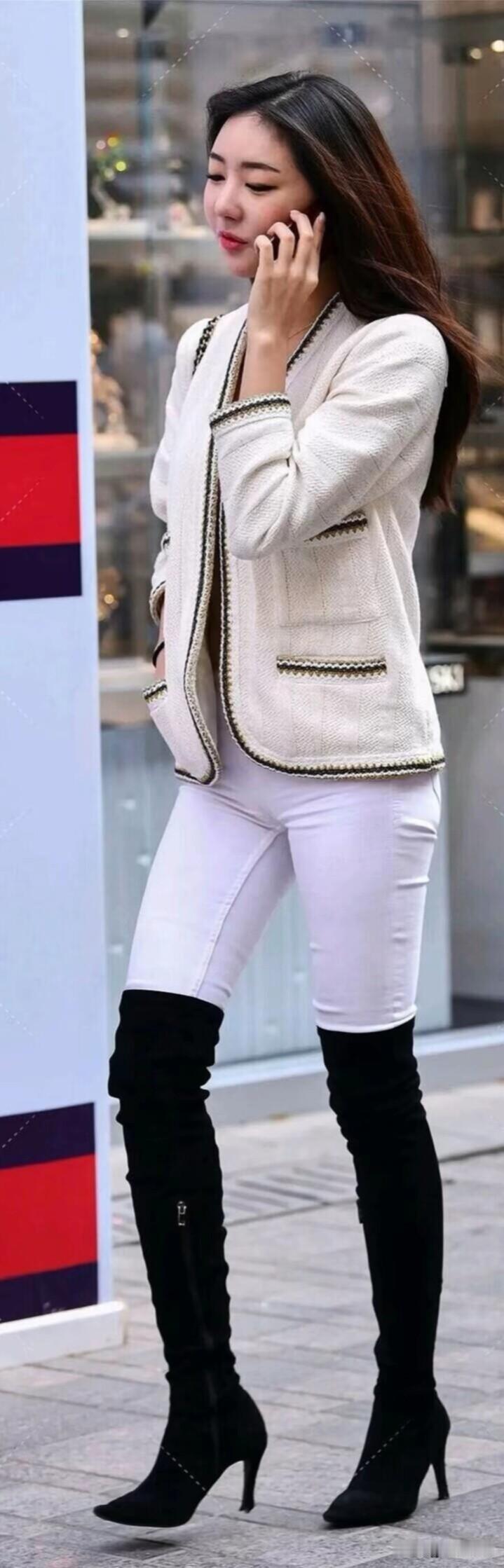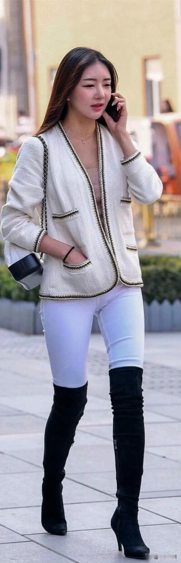 米白外套配白色长裤与黑过膝靴,优雅又时尚,日常这么穿太有气质啦~