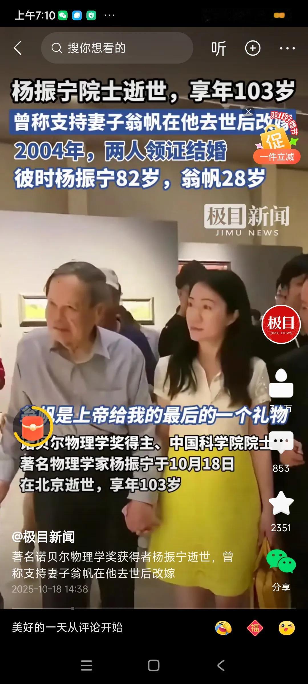 老夫少妻相伴21年,翁帆从一个美少女,变成中年人了,今年有49岁了,,,, 杨老晚年幸福,翁帆细心照顾,才能活到103岁,我大伯90岁时,身体一直很好,当时大家认为,活到100岁一点问题也没有,,天有不测风云,我大伯母88岁先走了,,只留下大伯父一个人,,,以前两个人天天吵架,这下剩一个人了,吵架的人也没了,,[捂脸][捂脸],大伯父生活发生大变化了,万念俱灰,,一年后也走了,,,
