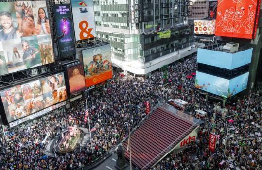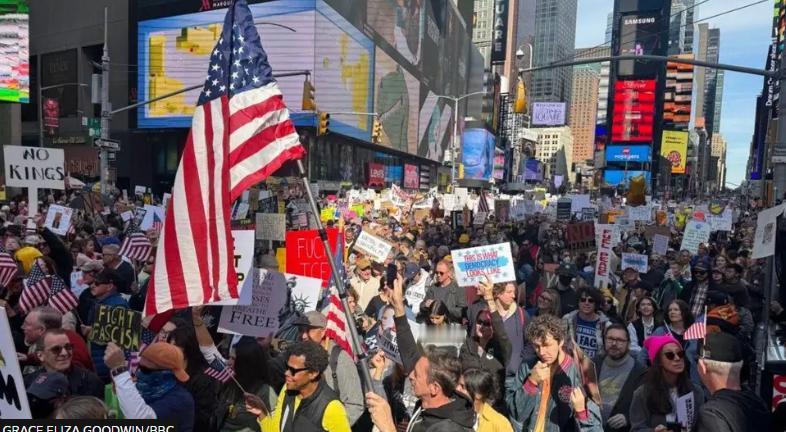 【时代广场——世界最具标志性的场所之一——今天挤满了“反对国王”运动的抗议者。人群绵延数个街区,向曼哈顿下城方向蔓延。】反对国王运动是2025年6月14日在美国发生的一系列示威活动[6][7]。该日恰逢美国陆军建军250周年阅兵典礼,以及美国总统唐纳德·特朗普79岁生日。抗议者借此表达对第二次特朗普总统任期内政策与作为的不满与反对。当天美国有5百万人参加了超过2,000场抗议活动,这是自特朗普第二届政府上台以来规模最大的抗议活动。据BBC报道,美国人对唐纳德·特朗普的看法存在严重分歧。最近的路透社/益普索民意调查显示,只有40%的人认可他作为总统的表现,而58%的人不认可。这使得他的支持率与他第一任期的平均支持率大致相当,但低于他今年1月第二次就任时的47%。随着任期的推移,总统的受欢迎程度下降是很常见的。据路透社/益普索统计,2021年1月,乔·拜登的支持率为 55%。到同年 10 月,他的支持率已下降至 46%。