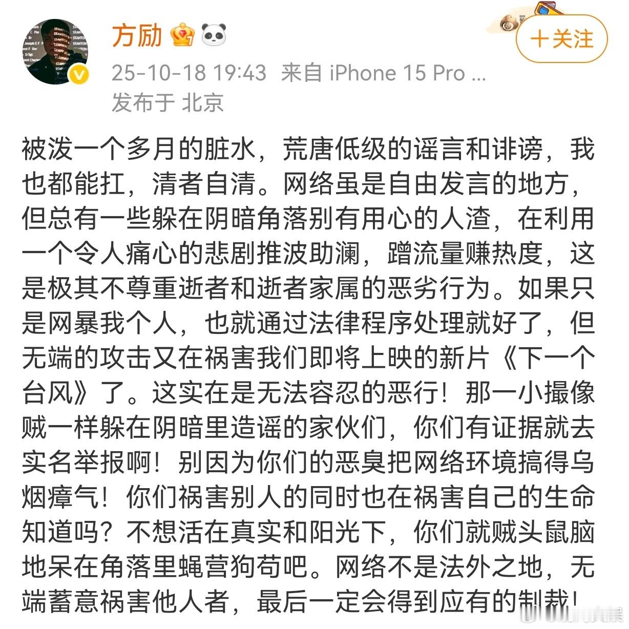 方励导演转发表示,网络虽是自由发言的地方,但总有一些躲在阴暗角落别有用心的人渣,在利用一个令人痛心的悲剧推波助澜,蹭流量赚热度,这是极其不尊重逝者和逝者家属的恶劣行为。“那一小撮像贼一样躲在阴暗里造谣的家伙们,你们有证据就去实名举报啊!别因为你们的恶臭把网络环境搞得乌烟瘴气!你们祸害别人的同时也在祸害自己的生命知道吗?不想活在真实和阳光下,你们就贼头鼠脑地呆在角落里蝇营狗苟吧。网络不是法外之地,无端蓄意祸害他人者,最后一定会得到应有的制裁!”