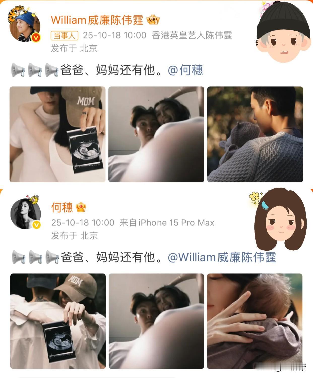 陈伟霆和何穗自2021年被拍到疑似恋情后,对待私生活的态度一直非常低调和谨慎。他们几乎从未在公开场合主动谈论彼此的关系,也极力保护个人隐私。看到他们的官宣“爸爸、妈妈、还有他”还是挺惊讶的! 这种方式简直就是“最高级别”的浪漫官宣:拥抱+手持B超照+“爸爸妈妈”文案——是明星官宣怀孕的“顶配”版本。 仔细观察爸爸妈妈的鼻梁都是高挺的,那么他们的孩子从爸爸那里获得高鼻梁基因 + 从妈妈那里获得高鼻梁基因高鼻梁(并且可能比父母更挺拔)。 凭借父母双方优越的外形条件(爸爸帅气有型,妈妈是国际超模),这个宝宝从怀孕伊始就被冠以“颜值天花板宝宝”的期待,注定会成为未来备受关注的“星二代”。 自从2021年被拍到照片以来,他们一直低调处理感情。这样的官宣,或许对他们之间稳定而深厚感情的最好证明,也让所有关于他们关系的猜测尘埃落定,只剩下祝福。