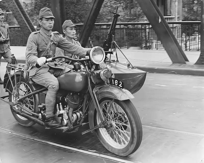 图中我们所见的,便是日军的跨斗摩托车,其学名为97式边斗摩托。可别小瞧这种摩托车,它的挎兜里往往坐着一名机枪手,边驾驶边冲锋扫射。在那个年代,这算得上半机械化冲锋,能横扫前方阵地,威力极大。日本常将其用于冲锋和交通,日本的通信兵也常配备这种摩托车来递送情报、传递消息,既及时又快捷。 二战后期,我军缴获了大量此类跨斗摩托车,基本将其用作通讯员传递军情的工具。中国解放后,这种摩托车被成功研制出来,后来成了我军通讯员的交通工具,部分地方公安也有配备,为快速出行办案提供了便利。直至80年代,仍能见到这种摩托车的身影。