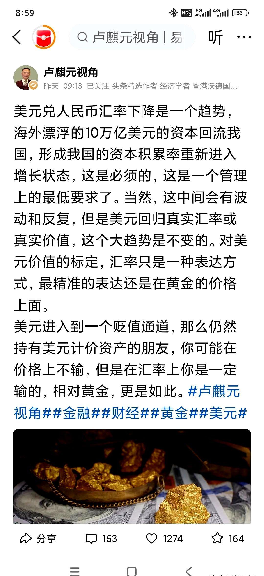 黄金大涨、美元贬值是价值回归? 卢麒元老师指明方向,周五黄金大跌200美元,是否有人被甩下了车? 卢麒元老师最近的一个观点特别好,就是美元兑人民币贬值是长期趋势,被高估的美元价值回归是必然的,最精准的指标就是黄金的升值。 网友对此说道: 每一次回调都是上车的机会,在5000美元一盎司之前,黄金请无脑做多。 对于黄金看涨的也有,看跌也有,但是看跌似乎更多,一切都交给时间去验证。不过话说回来,涨多了回调是必然的,不可能只涨不跌。 不加杠杆的多头稳如老狗,加了杠杆的多头空头抖如筛糠[捂脸][捂脸][捂脸] 黄金局,美元虽然衰弱,但是至少还能挺20年,绝不是现在就能崩盘的。