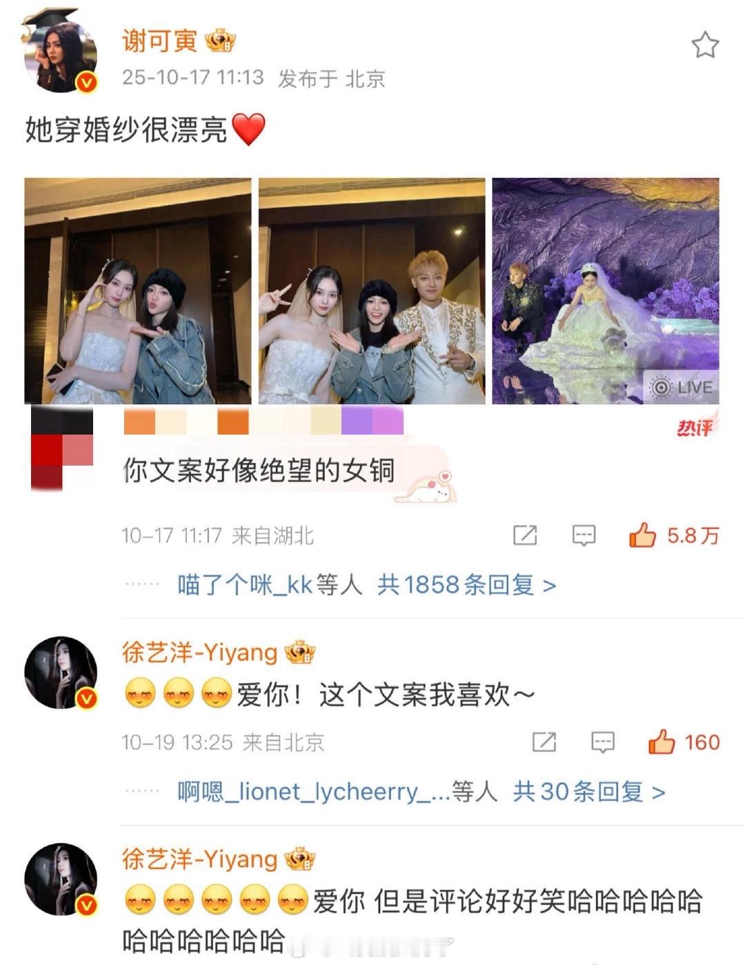 徐艺洋回复了谢可寅那条“她穿婚纱很漂亮”的微博,“爱你,这个文案我喜欢”、“但是评论区好好笑。”🌚是不是看到了说谢可寅同性恨(bushi)