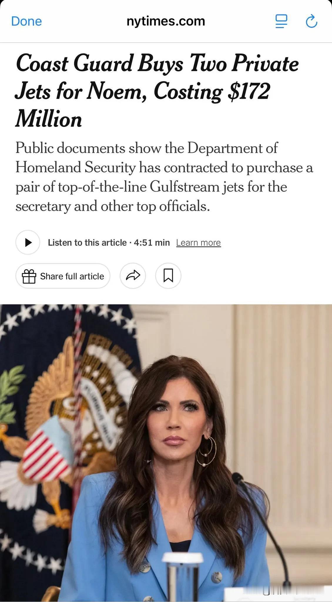 美国海岸警卫队花1.72亿美元为国土安全部长诺姆买了两架湾流私人飞机。拜登的部长