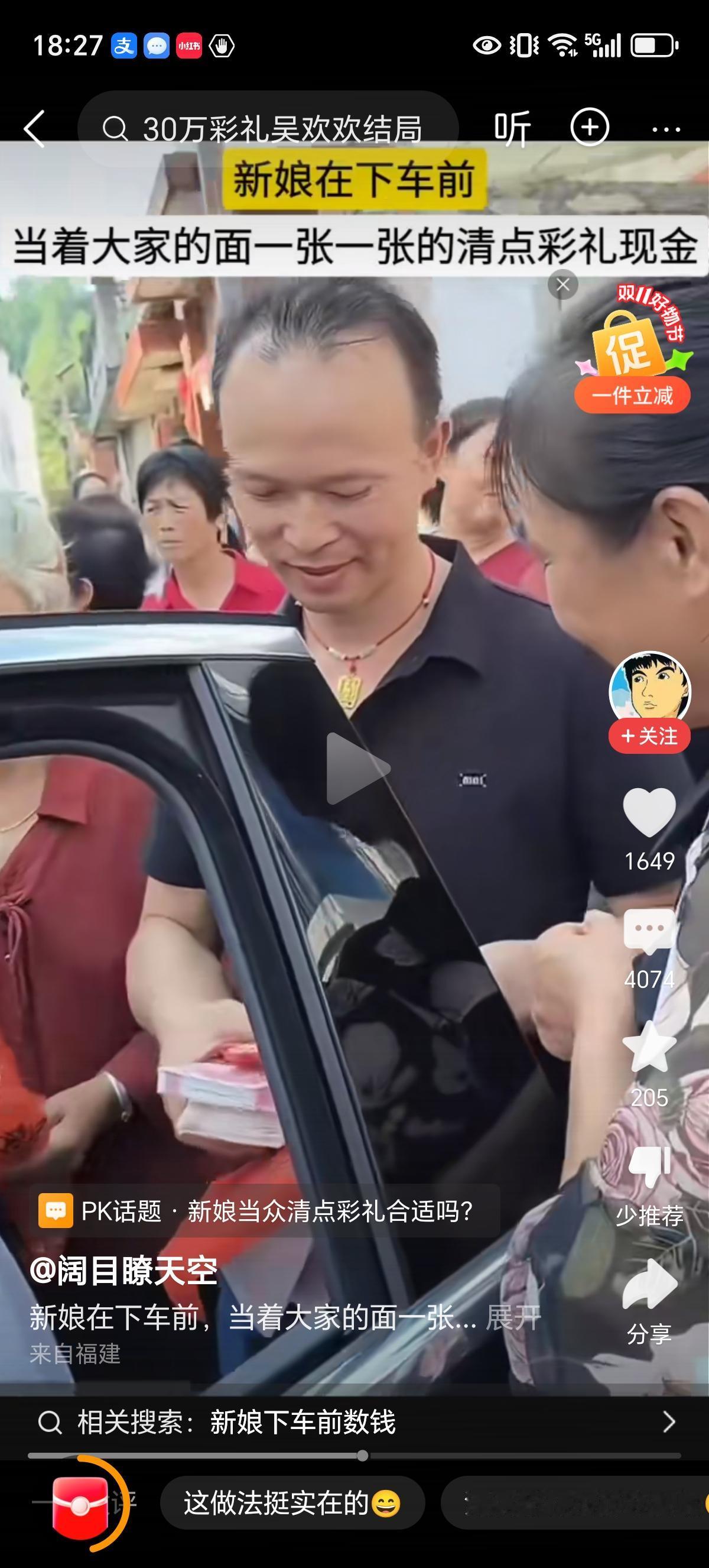 新娘子在喜车上数钱,这能数的完吗?万一要了好几十万彩礼得数到什么时候去啊,这钱还是一张一张慢慢数的,特别认真,一看手法就生疏的很,也不担心太慢误了及时吗? 可能数钱的感觉太快乐了,新娘已经忘记了自己在哪里了,都不记得自己今天结婚这件事情了,一心想着钱数不能错。为啥就不能等结完婚趴在被窝里再数呢,到时候是竖着数还是横着数,哪怕把钱铺满床铺也没有人管啊? 这等在车边上等着新娘拿了钱赶紧下车的人太有耐心了,连一句怨言都没有,但其他人就不一定了,指不定心里边怎么想新郎呢,没准心里边已经笑开花了,对于吃瓜群众来说,此时吃不吃席已经不重要了,看戏更得劲。 希望在喜车里数钱不是当地的风俗习惯,这真是太奇葩了,全村的男女老少能因为这件事情开心好几年。