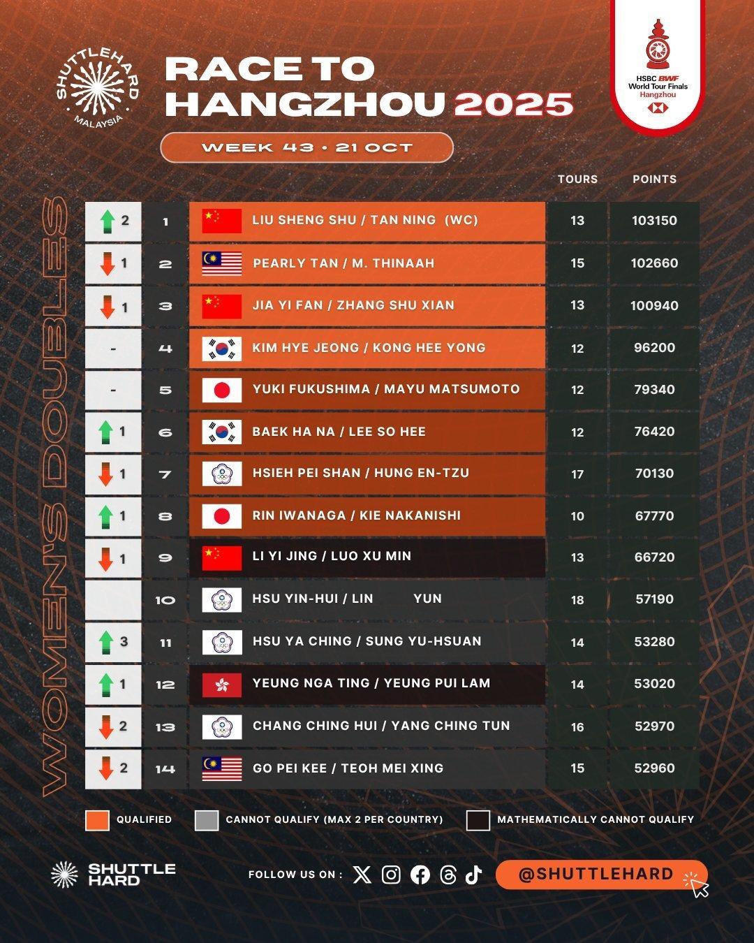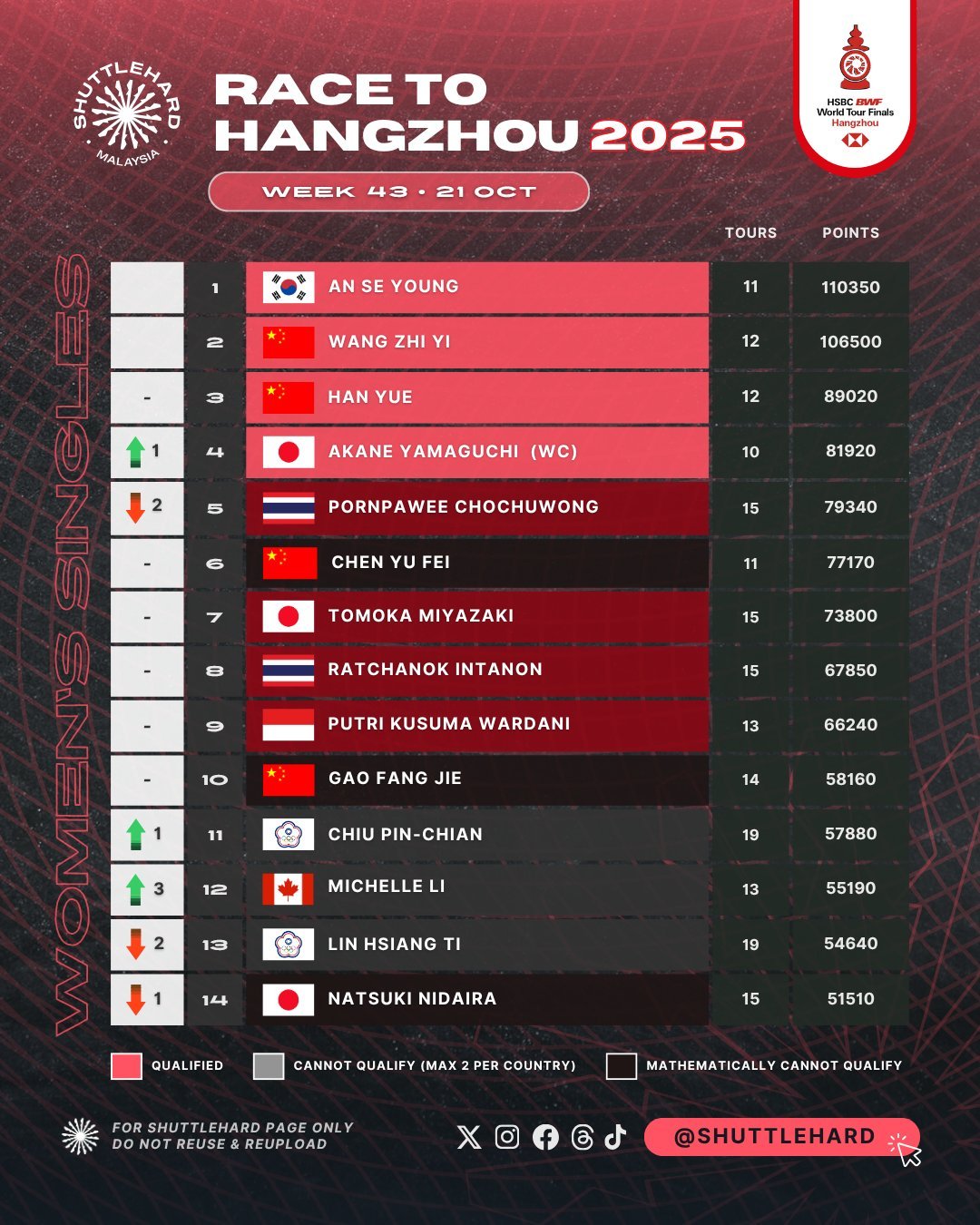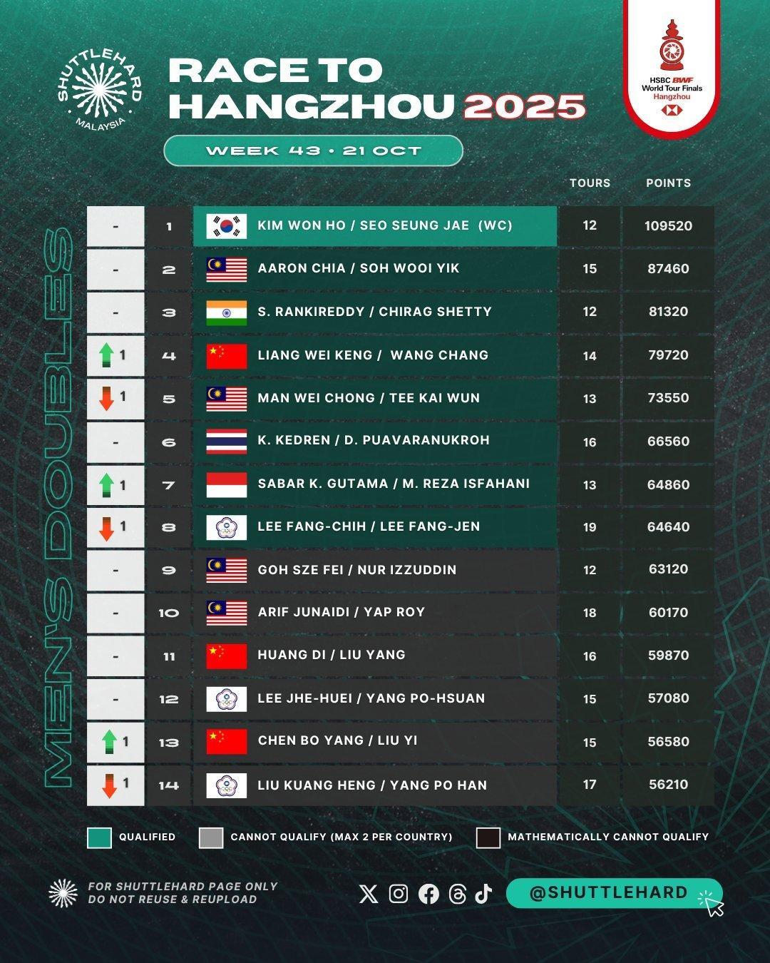 已确定入围【2025世界羽联世界巡回赛总决赛(12月17日-21日)】的有:(图片来自X:ShuttleHard)